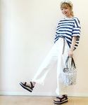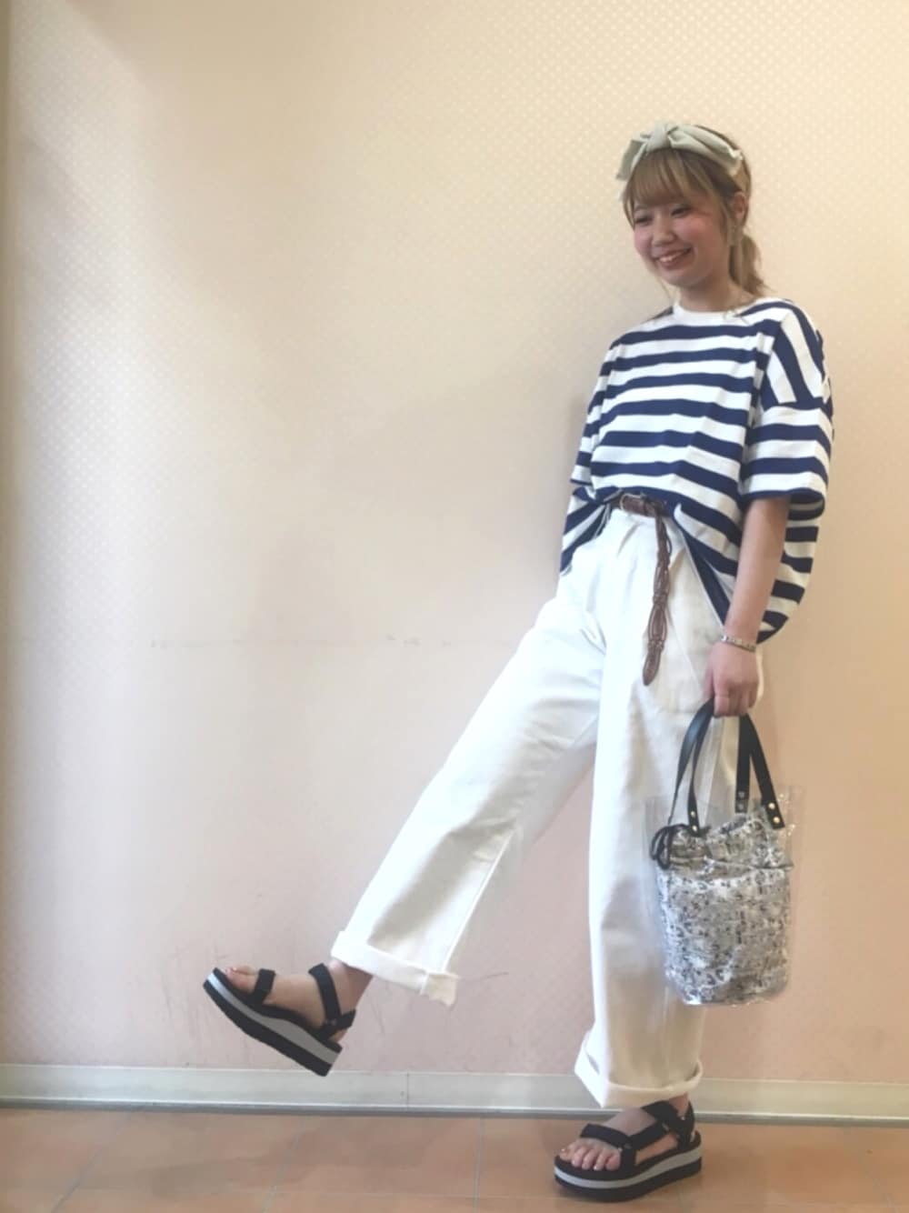 ザ☆マリンコーデ Tシャツはボーダーのピッチの太さと ゆるっと感が可愛いし 白のワイドデニムはウエストがしまってみえるから 細見え効果💯 シンプルな分、クリアバッグでトレンド感⚪️ 楽しいこと考えたからめっちゃ楽しそうな顔してる😂笑笑