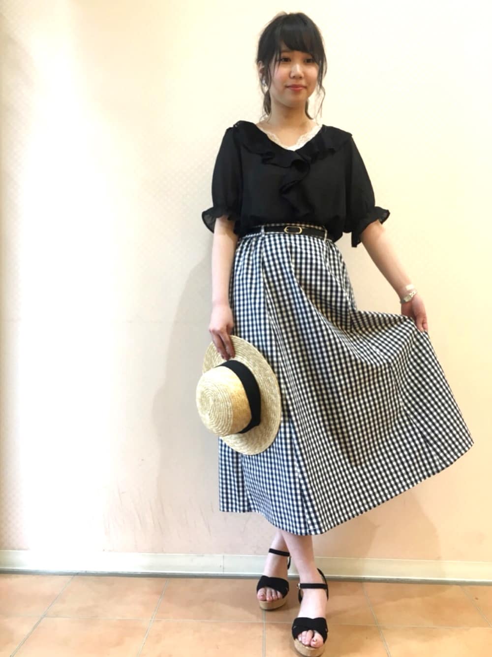 しずか(earth music&ecology)のスカート「・ベルト付きフレアーギンガムスカート ●」を使ったコーディネート
