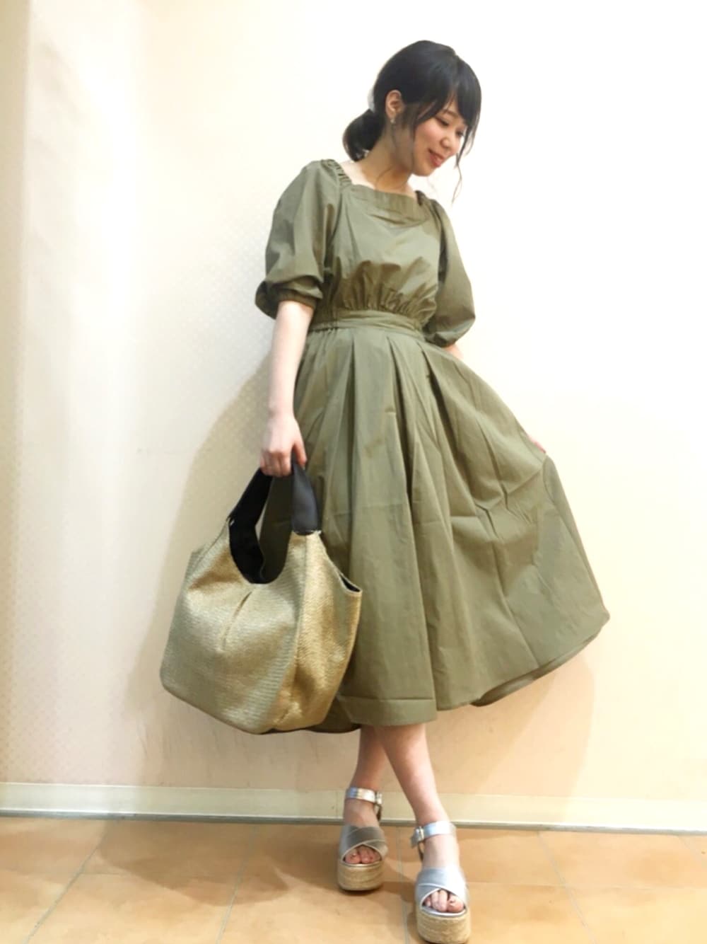 ベージュのワンピース👗 袖のボリューム、ウエストのキュってなってるところ、 丈感、シルエット、申し分なし😭💯