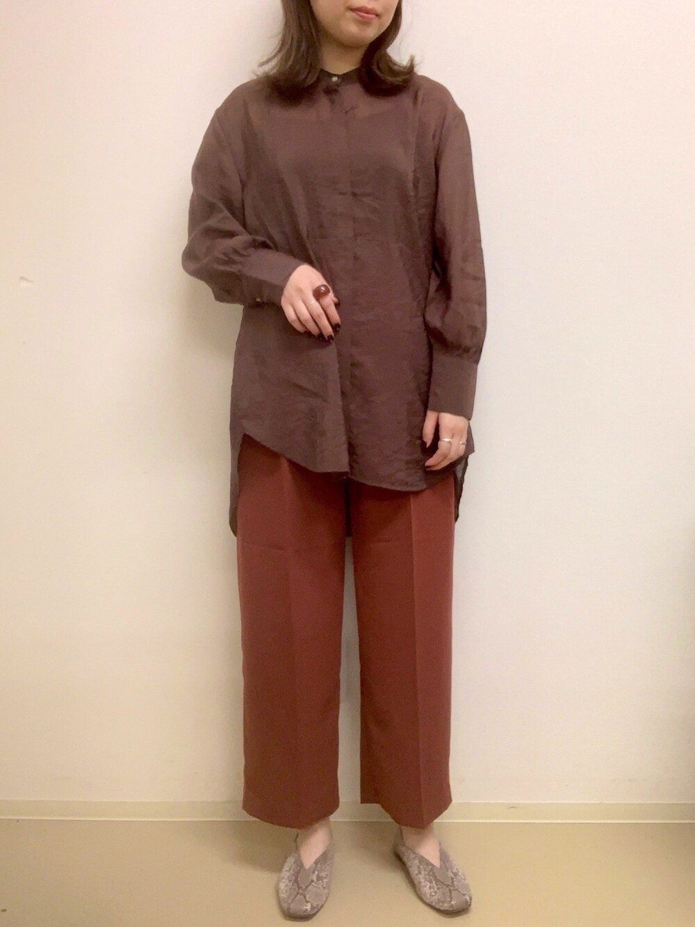 ブラウンのシアーシャツに テラコッタのパンツで 同系色でまとめたコーデ🍁 シアーシャツはやや透け感あるくらいで 今の季節にぴったり😚 パンツはシルエットがキレイです🥰🥰 バブーシュはかかとをつぶして履いても🙆♀️