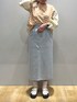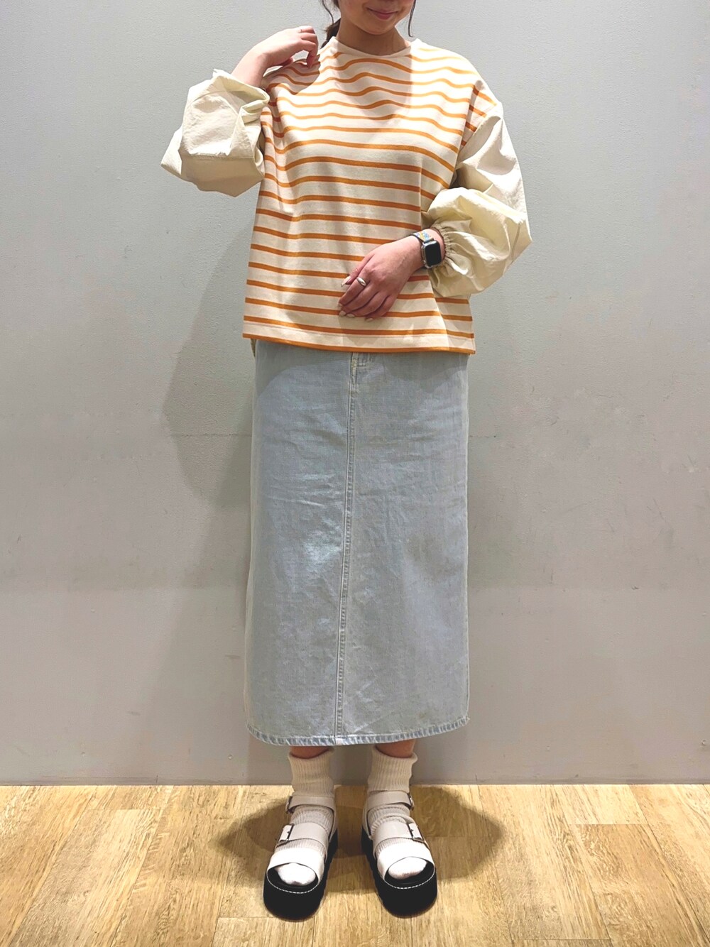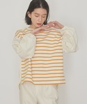 しずか(earth music&ecology)のTシャツ/カットソー「袖ボリューム異素材ボーダーポンチプルオーバー」を使ったコーディネート