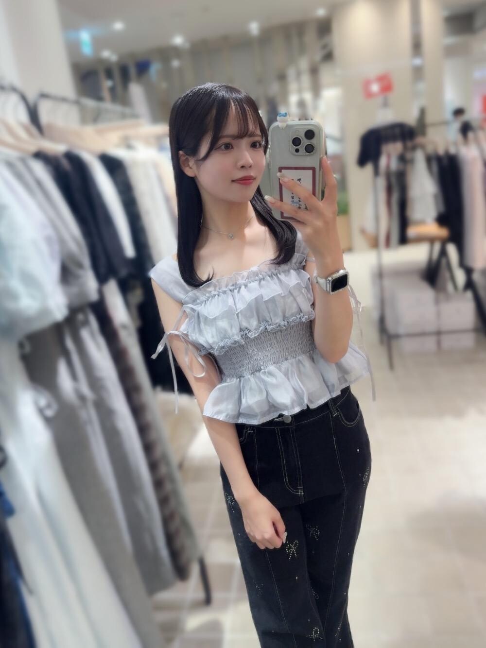 トップスは、淡い水色にサテンのような艶っとした素材がとてもかわいいです🦢🤍 リボンの部分を肩から外して着るのがトレンドっぽく🎀 デニムと合わせて、キレイめカジュアルで着るのも◎