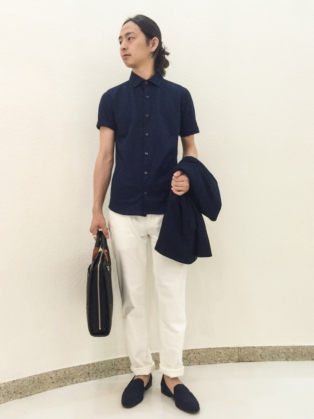 ONOFF兼用で使える前開きポロシャツ。 白パンはデニム生地がカジュアルにも使えて最適です♩ ▼▲▼▲