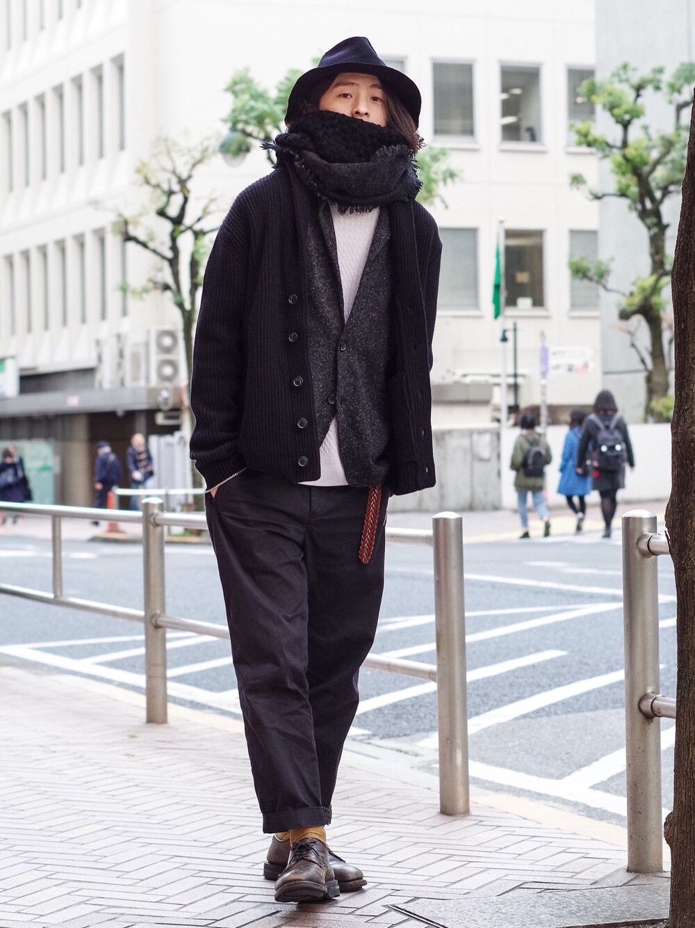『ニットonニットonニット』です。 そして、ぐるぐるスヌード。 一番上のニットはオーバーサイズのXLで、カーディガンをアウター感覚にアレンジしてみました。
