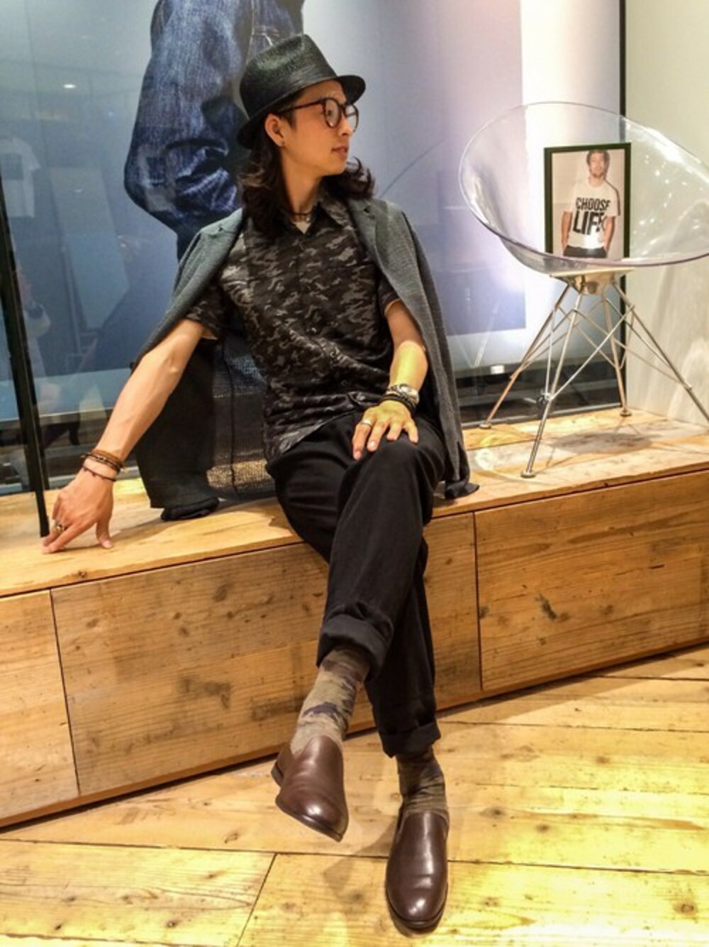 シックなポロシャツスタイル。 上下で「カモ×カモ」と「緑×緑」で遊んでます。