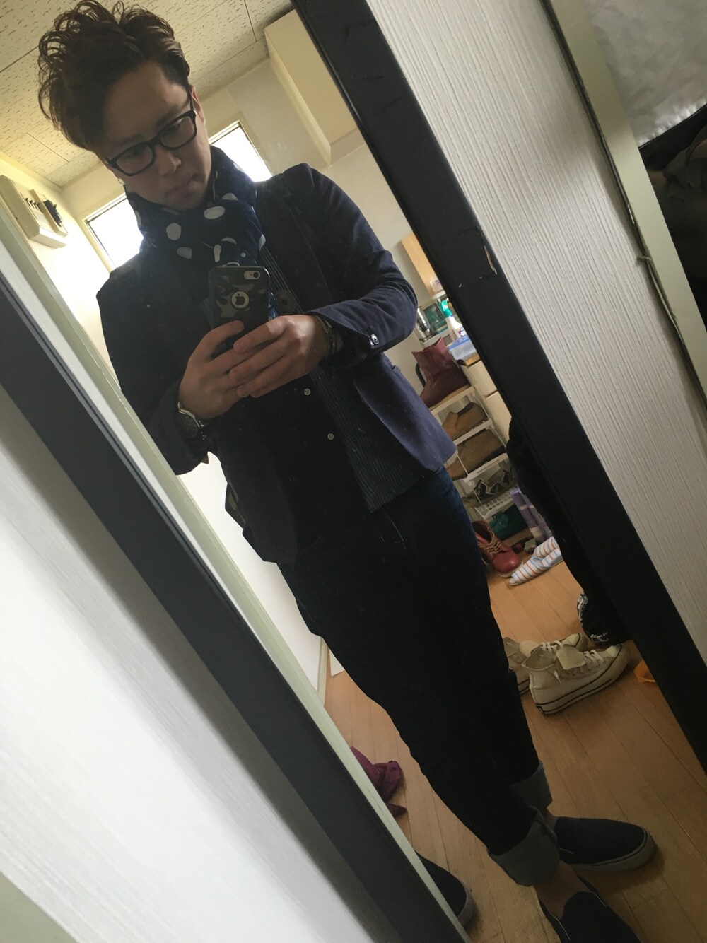 いいね、セーブありがとうございます♪ フォローお願いします フォロバします♪ 大好きなネイビーコーデ♪ 首もとにドット柄のストールで 少し外しました。