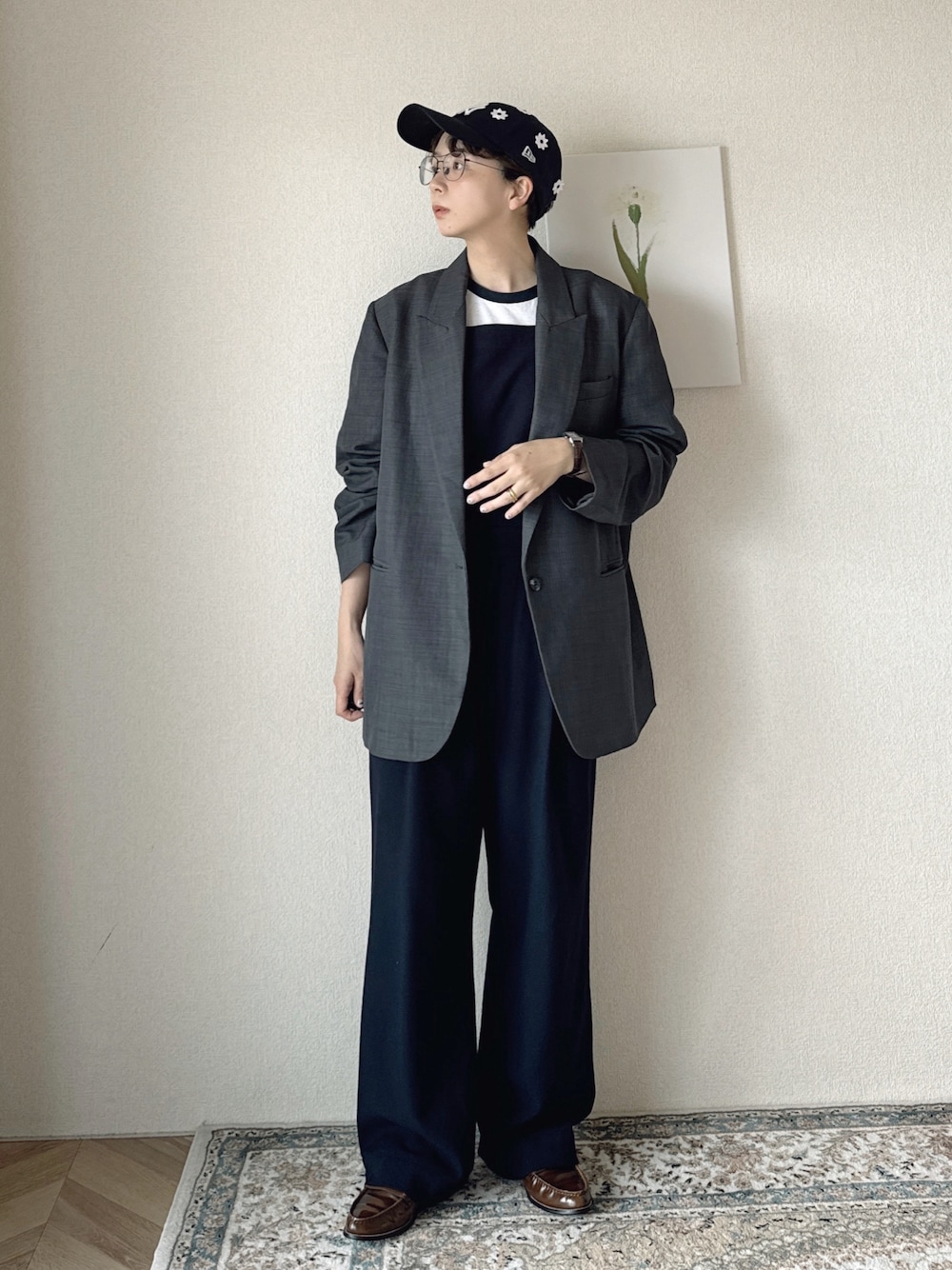 まだ肌寒い日もあるので、中は半袖Tでアウターは軽めジャケットを。 綺麗めにまとめつつメンズライク感もあるこのスタイルがお気に入り。