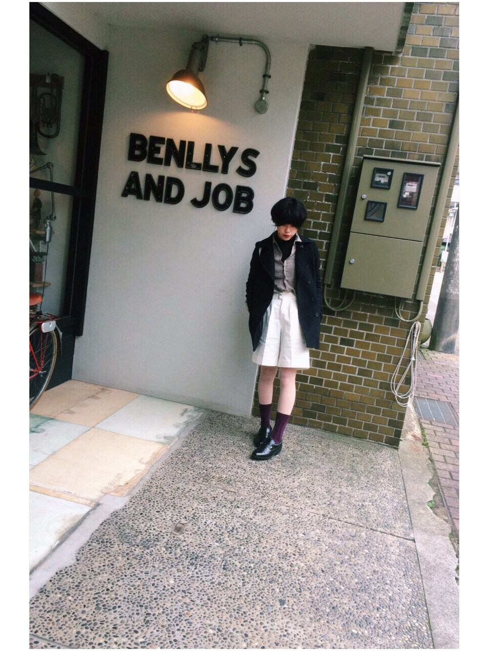 イン 金沢 (シンタテ商店街にあった素敵な生活雑貨のお店の前で) 下ろしたてのハイウエストパンツはイタリアの軍の制服だって。シルエットがとてもすき コートは母、靴下は父、靴は祖父の いつもなにかしら借りてきてる
