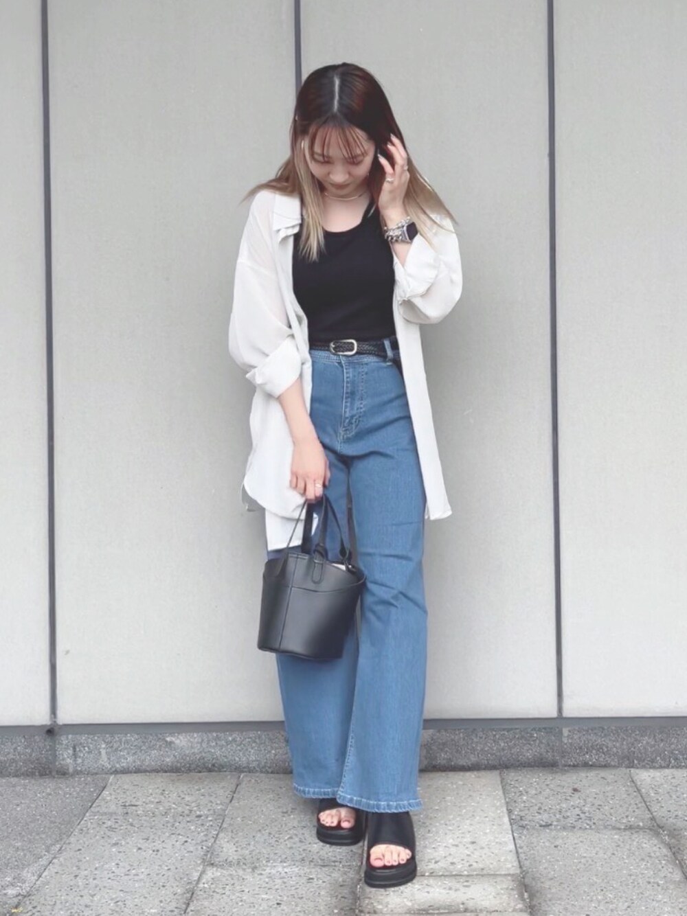 【レイヤリングタンクトップ】着用サイズ→M 【ボーイズライクビッグシャツ】着用サイズ→F 【カンフィフィットワイドデニムパンツ】着用サイズ→S 【minia 厚底ミュール】着用サイズ→M ・ ・
