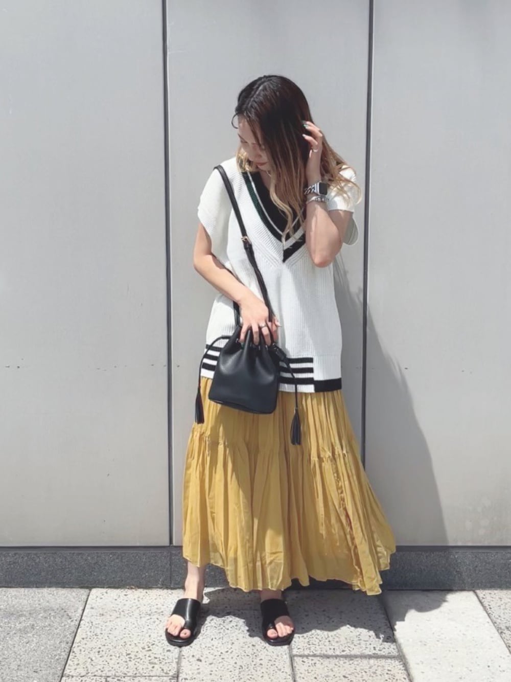 【カップ付きバックレースタンクトップ】着用サイズ→M 【アシンメトリーVネックチルデンベスト】着用サイズ→F 【ランダムプリーツボリュームスカート】着用サイズ→F 【minia カバートングサンダル】着用サイズ→M ・ ・