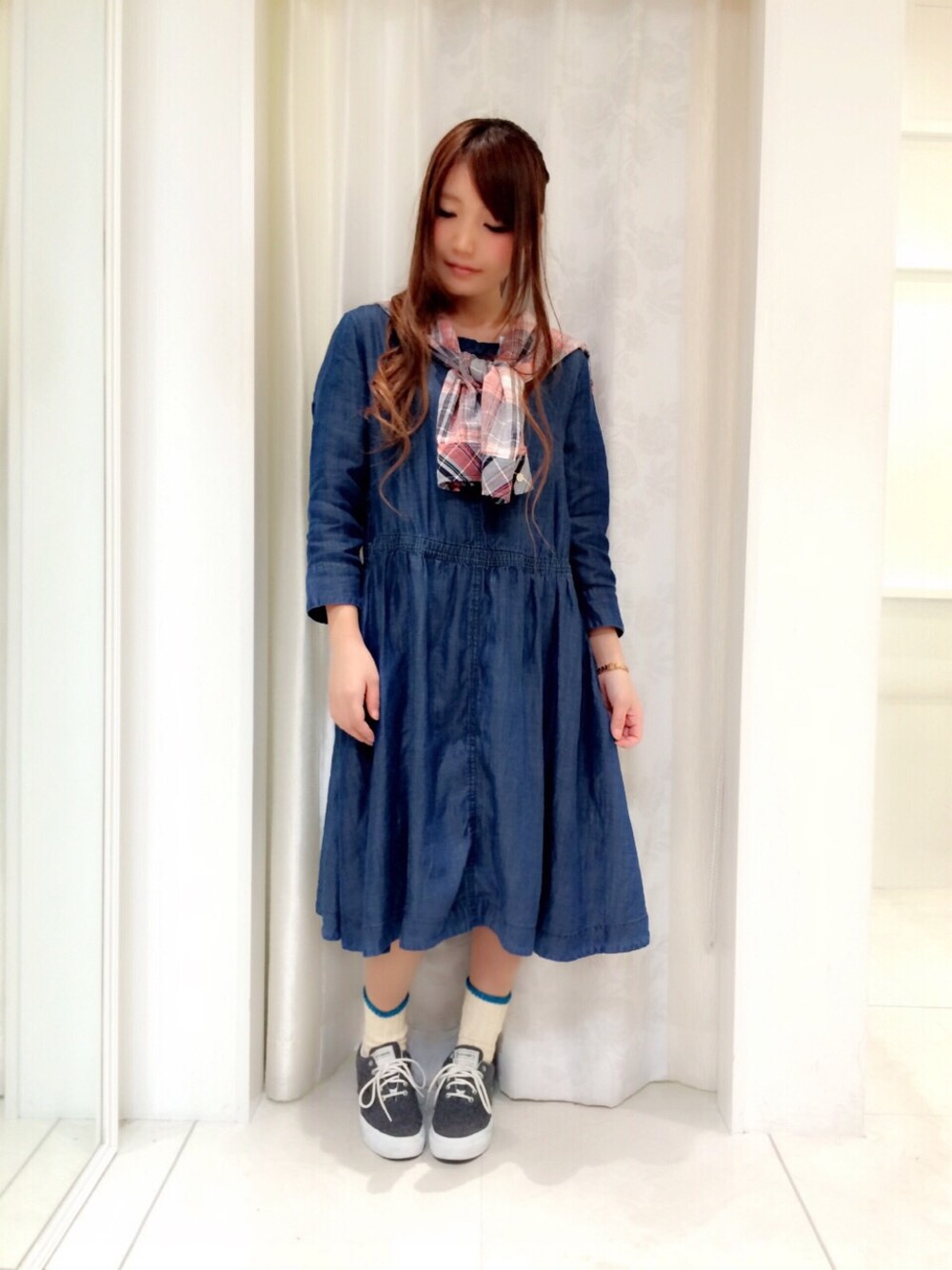 クルーネックのデニムワンピ♬ 肩掛けのチェックシャツがポイントです。 透け感のない楽チンスタイル。