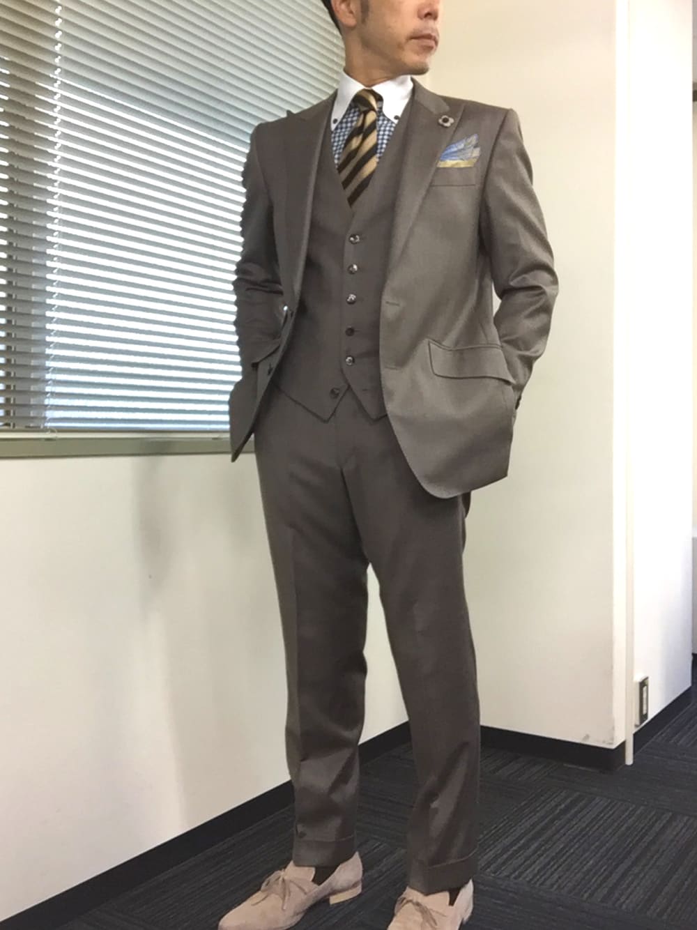 昨年と同じく、このスーツを着る季節となりました。ベージュのスーツに薄めのベージュのシューズを合わせました。歳を重ねたのと少し痩せたのが、昨年との違いです。ネクタイは、レジメンタルストライプより、無地の方が良いかな?客観的に見てみるのは、コーデだけでなく、普段の行動や言動など、結構大切ですね‼️