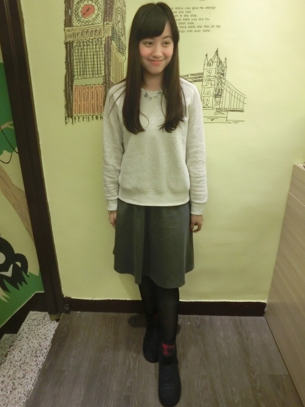 上衣:GU 裙子:GU 黑色褲襪:GU 紅色格子短襪:GU 項鏈:GU 雪靴:GU
