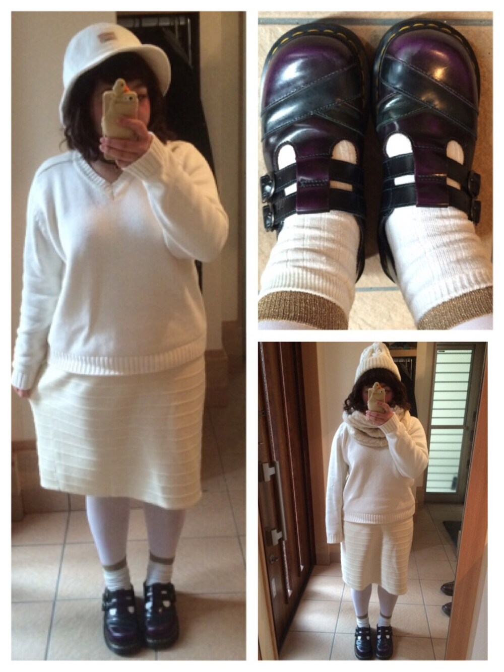 、 ニットーused スカートーused くつーマーチン バケハー古着屋 ニット帽ー古着屋 チョーカーーenvym スヌードー古着屋 靴下二枚履き!! 寒かったのもあるけど、ゴールドチラ見せで ワントーンのぼてっとした感じなくしたつもり❤️