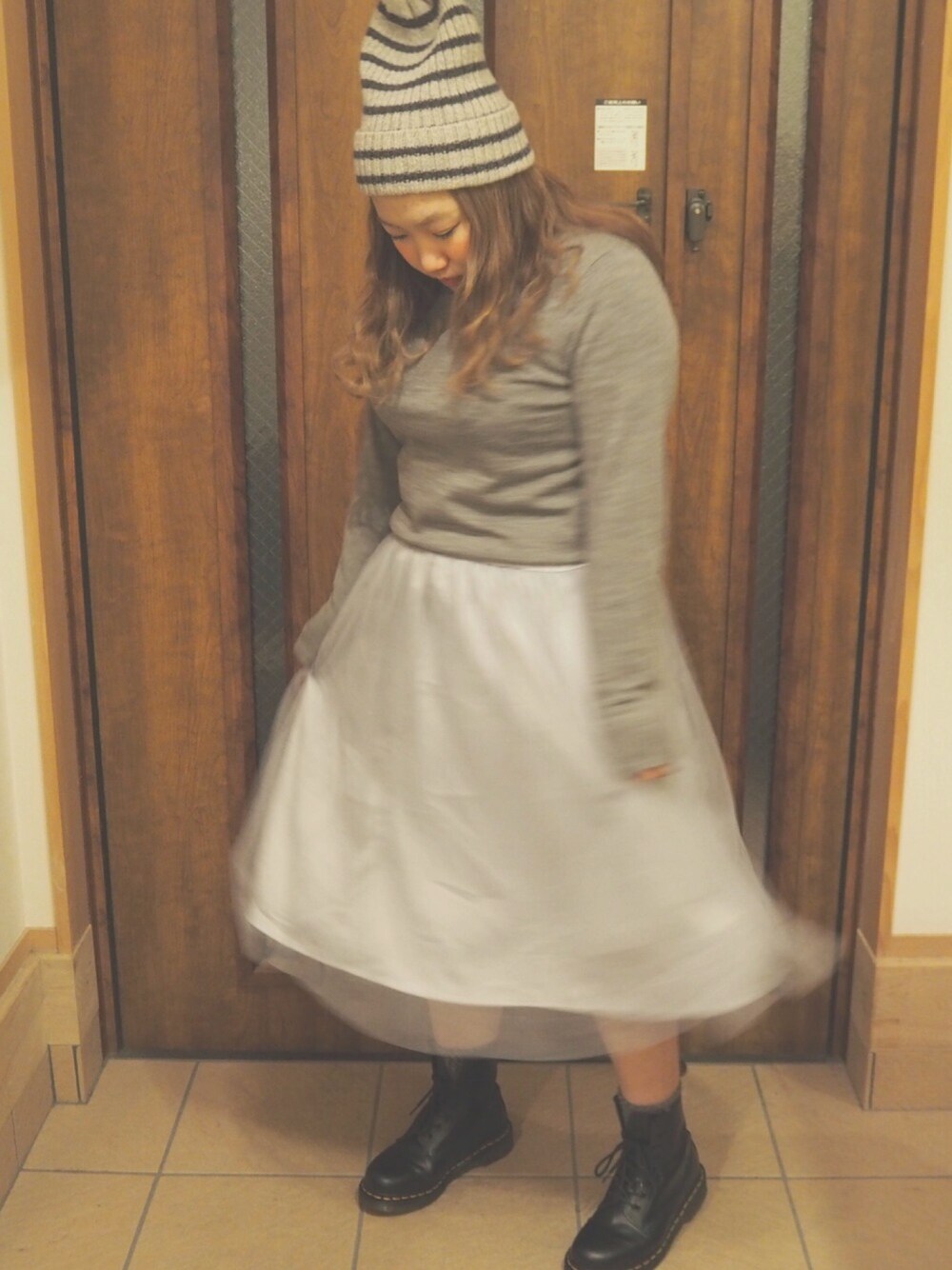 グレー × ブラック ニット : 無印良品 靴 : マーチン 帽子 : flower outer : ma-1