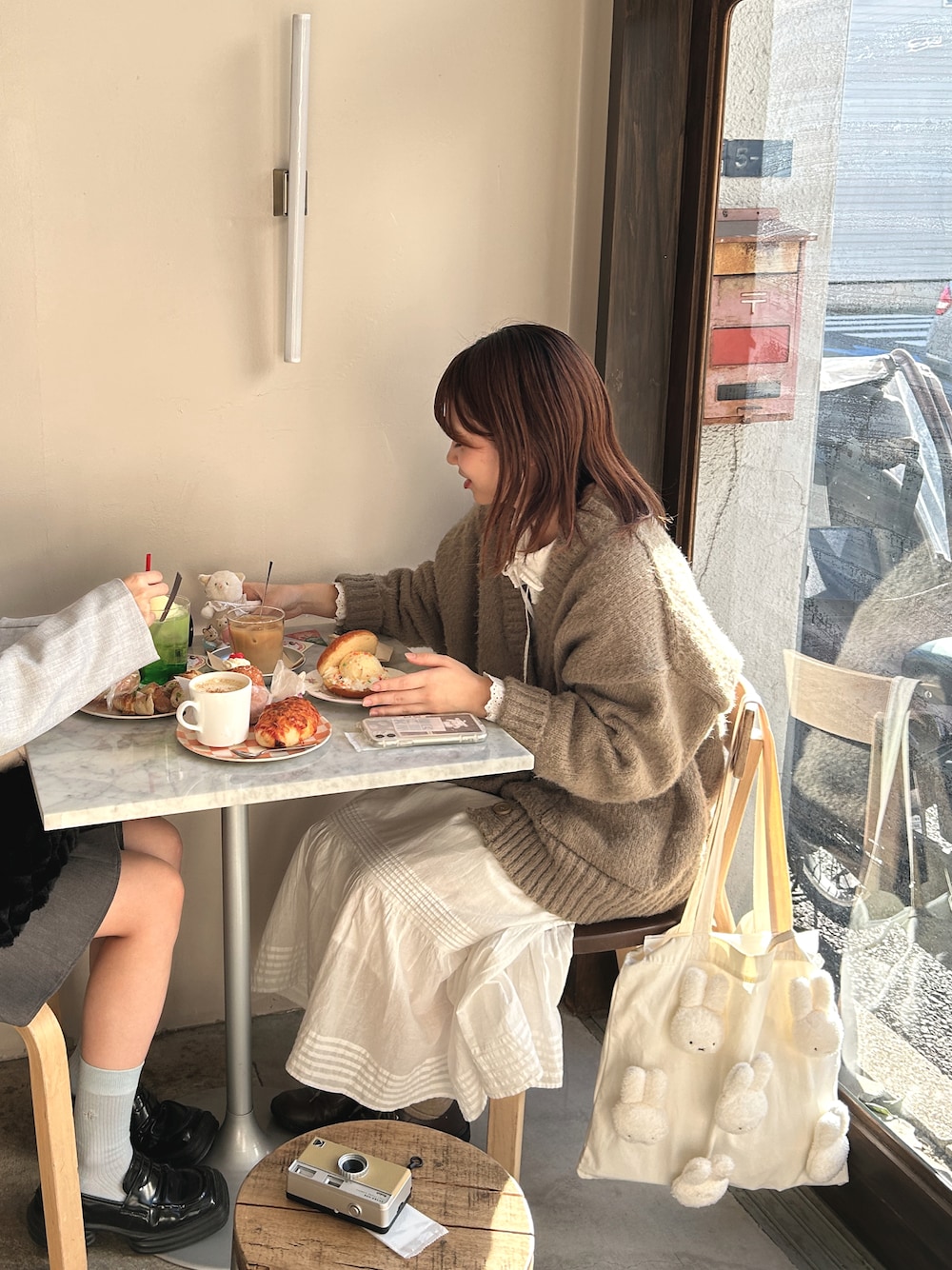 カフェコーデ🥞☕∗*゚ 寒いけどアウターをきたくなかったから 厚めのニットカーディガンでやりすごす○