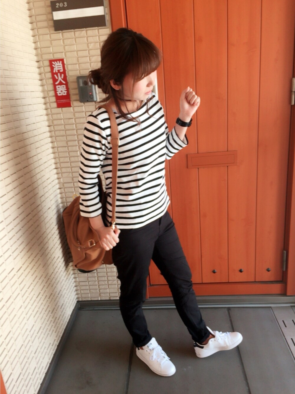 楽チンお出かけコーデ プチ山登りしてくるつもり(笑) ボーダーの服とスタンスミスは、旦那ちゃんと お揃い♡