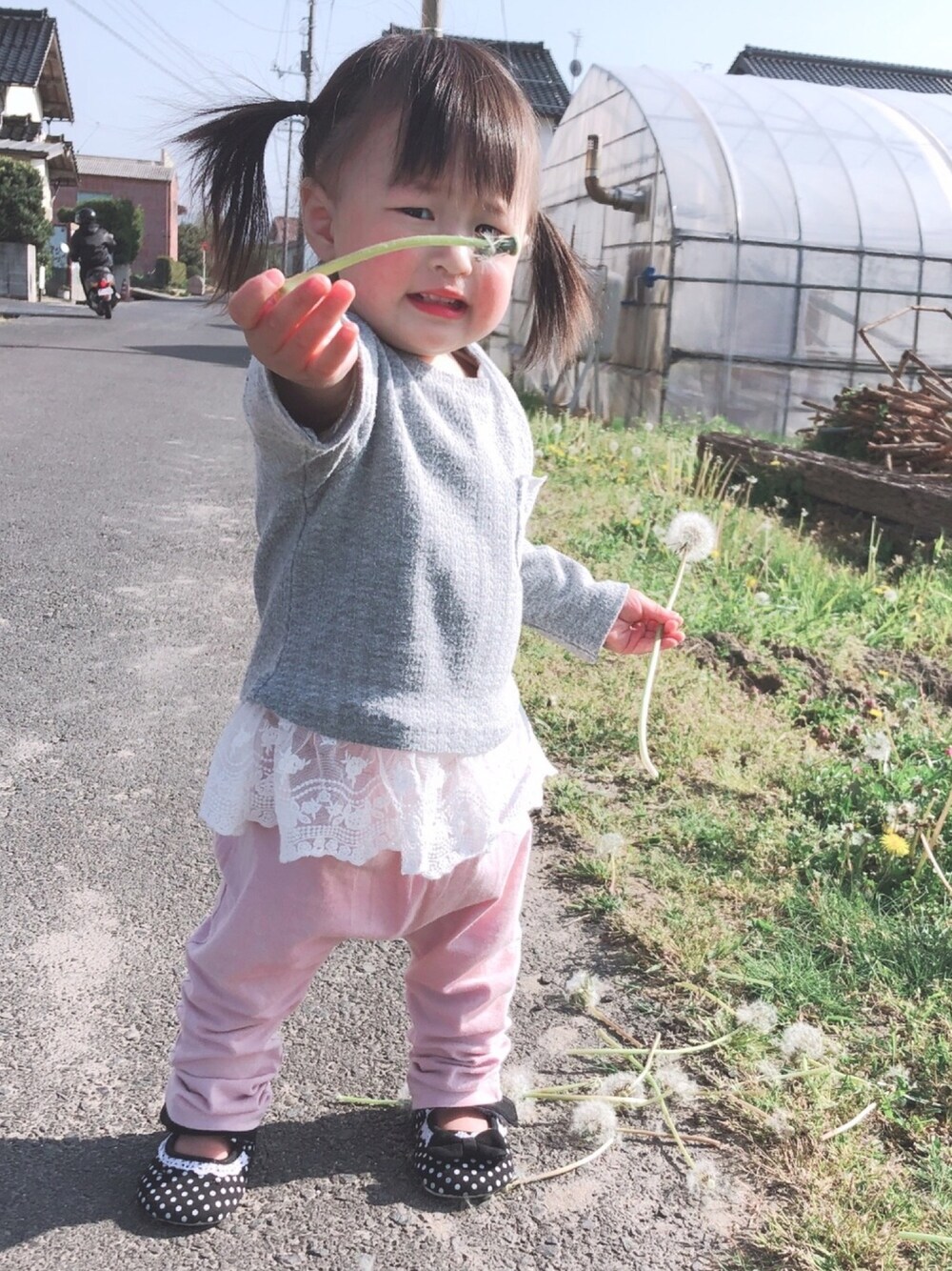家の近くにタンポポの綿毛がたくさんあって長女が気持ち悪いぐらい摘んできて母はうんざりしております( º_º ) 上の子のお下がりのトップス😊 やっぱこれ可愛い💕 上の子の洋服はお下がり前提で買ってます😂
