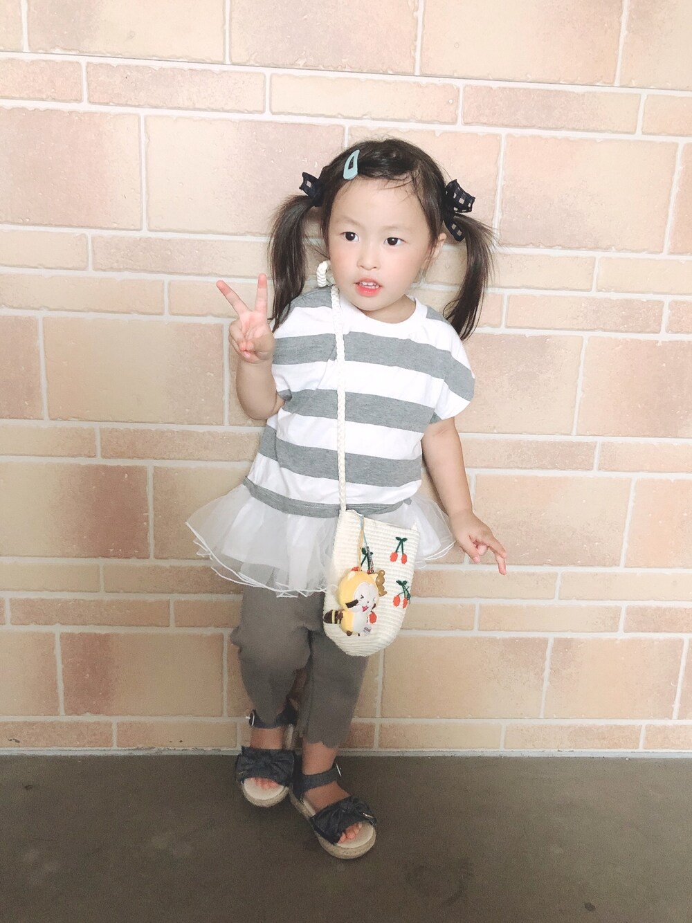 長女のお下がりトップス🎶 ヒラヒラになっててなんか喜んでた🤣 長女がヒラヒラ好きで、マネをしたがる次女🙄🌀 それはそれでめんどくさい😂