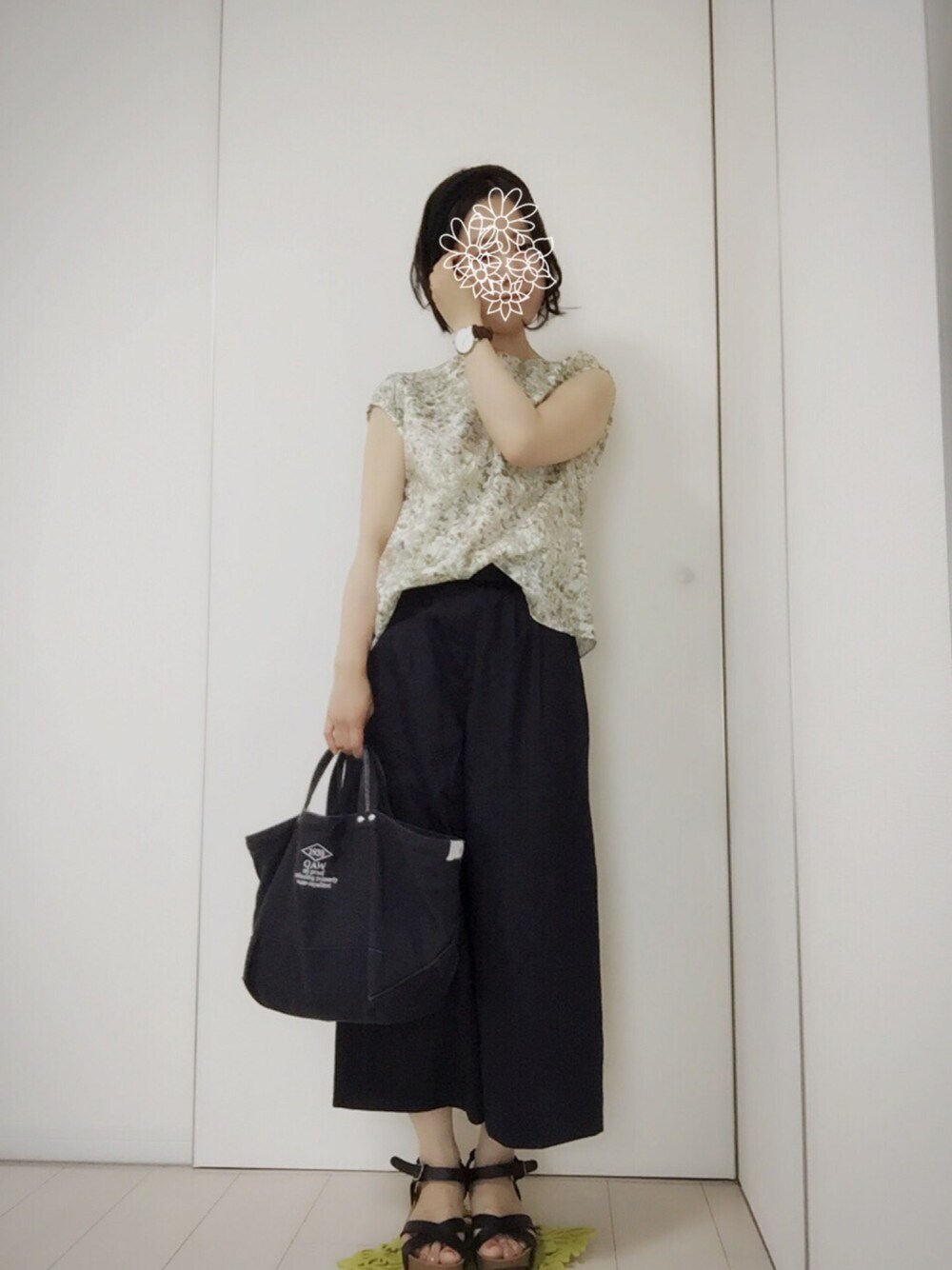昨日は暑かったので、半袖デビュー。 しっかりとした生地のガウチョは、光沢もあり、適度にキチンと感が出るので、お助けアイテムで す。 orneのトートはお安い割に、しっかりとした作りでお買い得アイテムでした。