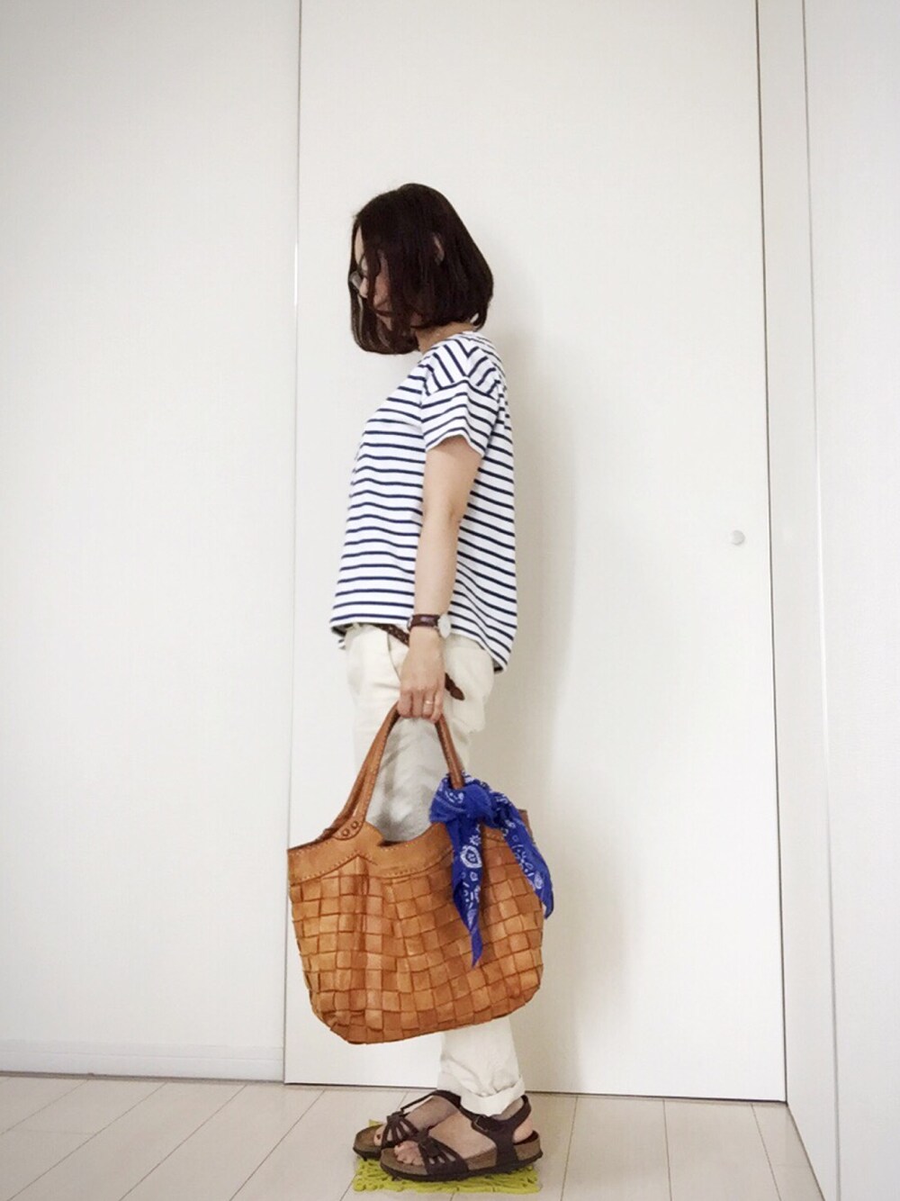 休日コーデ。遅く起きた朝。 遅めのランチを買いに、近くのベーグル屋さんへ。 有名ではないけれど、お気に入りのお店です。 メガネでごまかし、のんびり出発。