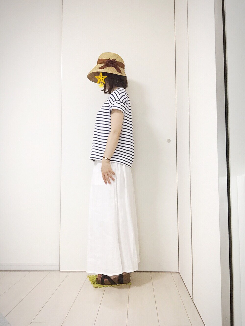 ボーダー×ホワイトコーデ。 無印のスカートはセール+さらに20%オフ。 お得なお買い物が出来ました☺︎ 暑い1日。日陰がたまらなく恋しかった今日。