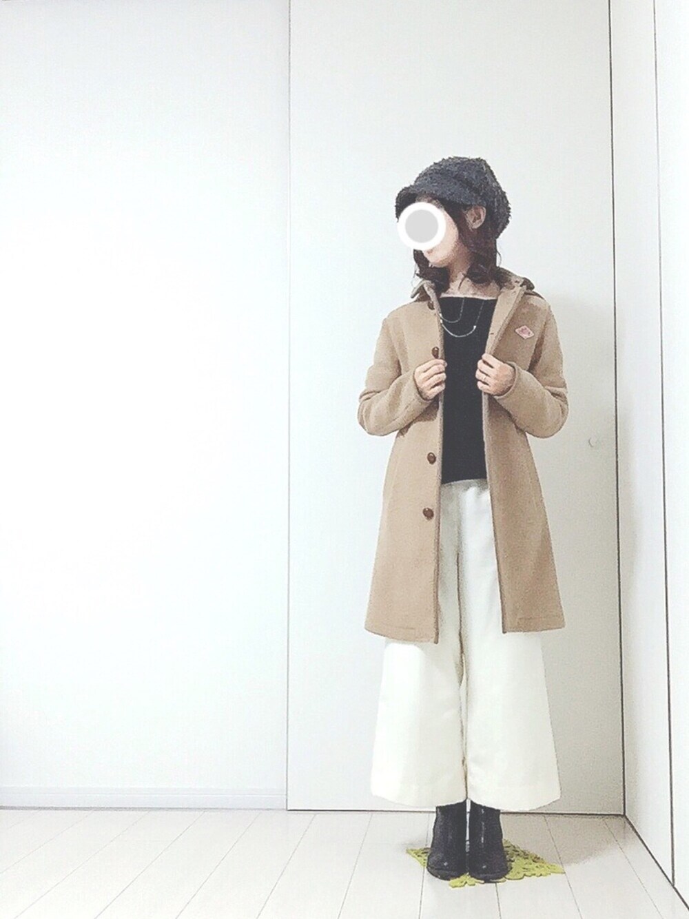 お正月中いつかのコーデ* ロングコート×ワイドパンツ 背丈の低い分はブーツでカバー☺︎ 背が低いので、ワイドパンツは敬遠しがちだったけれど、意外と使いやすい。 インナーはシンプルにモノトーンにしました* あと1日行けばおやすみ。。