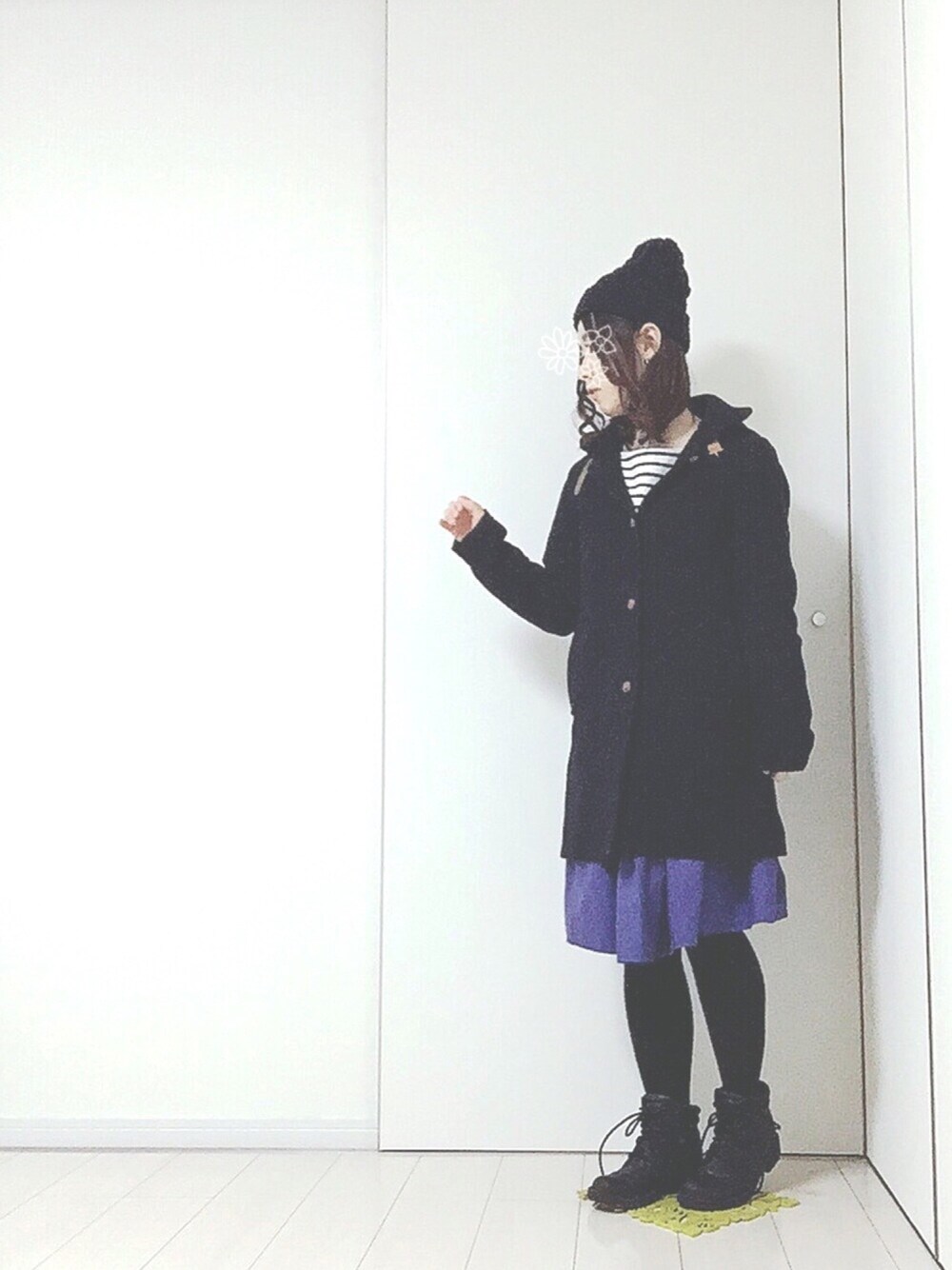 いつかの寒い日の記録* コートで暗くなりすぎないように、 ボーダーとブルーのスカートで、少し明るくしてみました☺︎ 変な手の位置のまま、シャッターかしゃり。笑