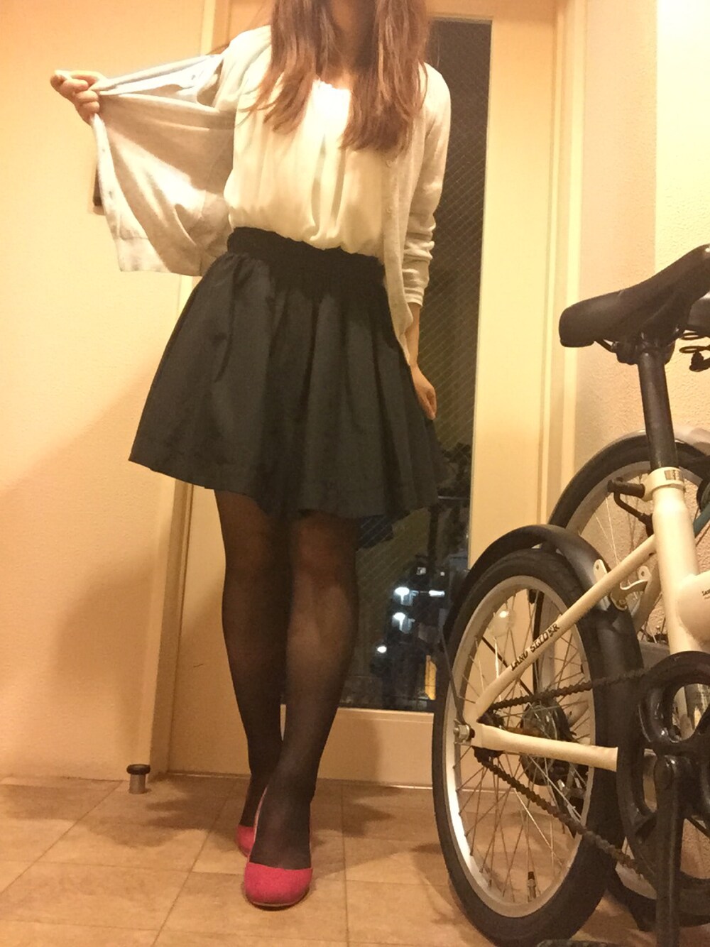 シンプルだけど、ちょっと目立つピンクの靴で地味にならないように! 雨降ってるけど、晴雨兼用のパンプスだから、雨の日でもおしゃれ楽しめる♡