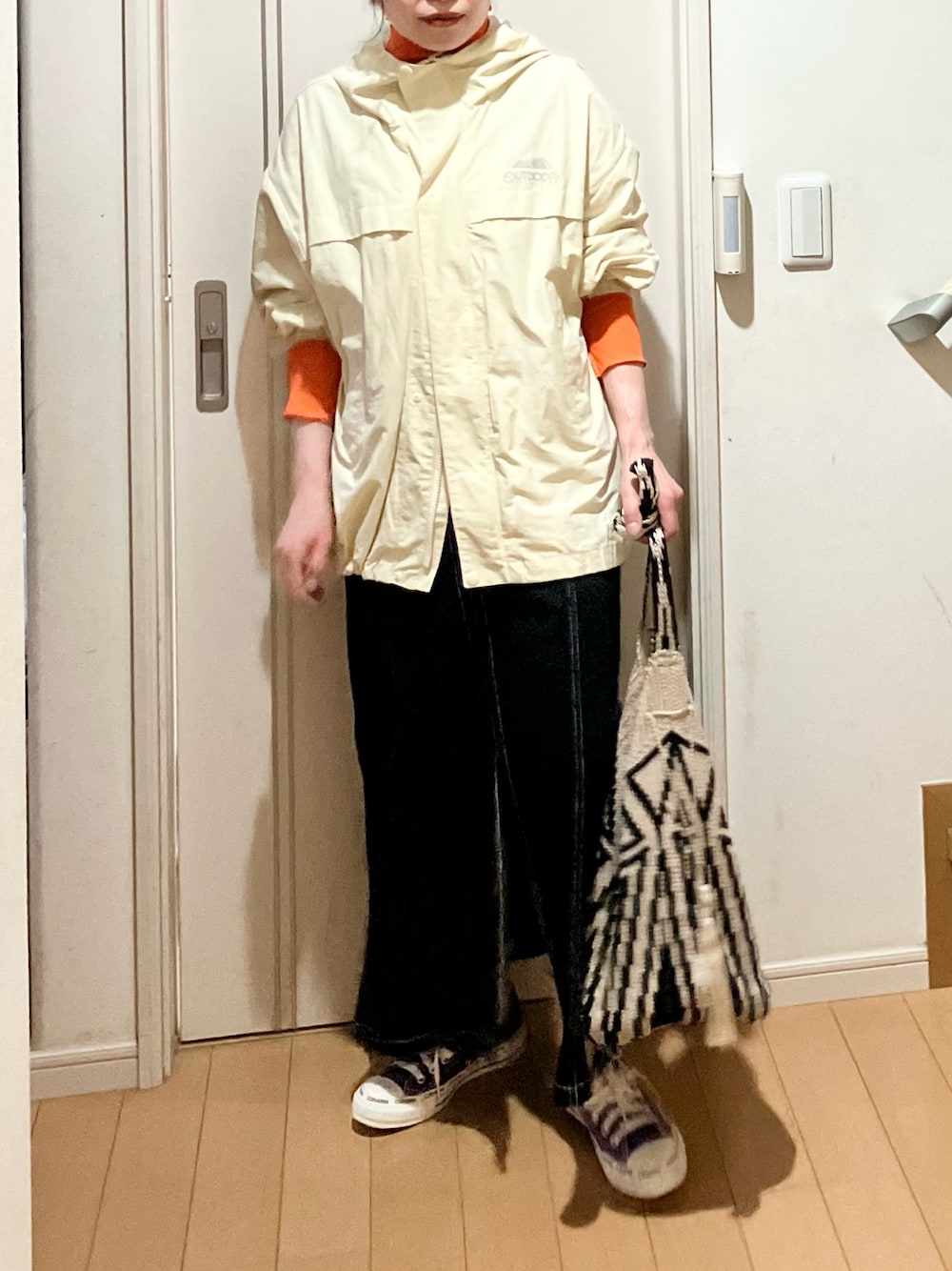 ご覧いただきありがとうございます♪ いいね・save・フォローいただくとうれしいです♪ マウンテンパーカーをキレイめにカジュアルに。 インナーのオレンジがポイントです♡