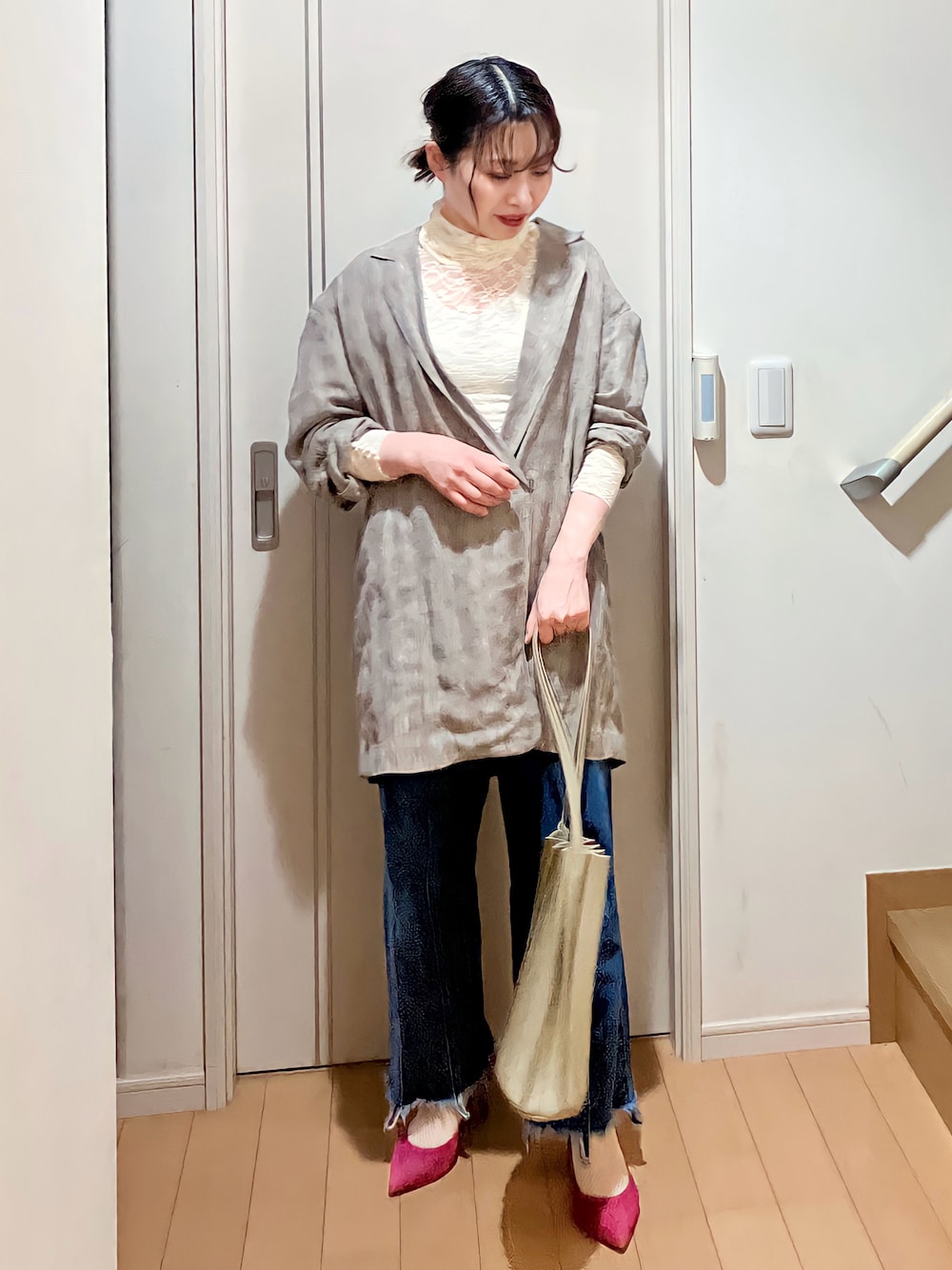 ご覧いただきありがとうございます♪ いいね・save・フォローいただくとうれしいです。 軽くて、ゆったりとしたサイズ感♡ 腰まわりが隠れるので、体系カバーできるのがうれしい♪ お袖をたくし上げて、パンプスでカジュアル過ぎずキレイめに。