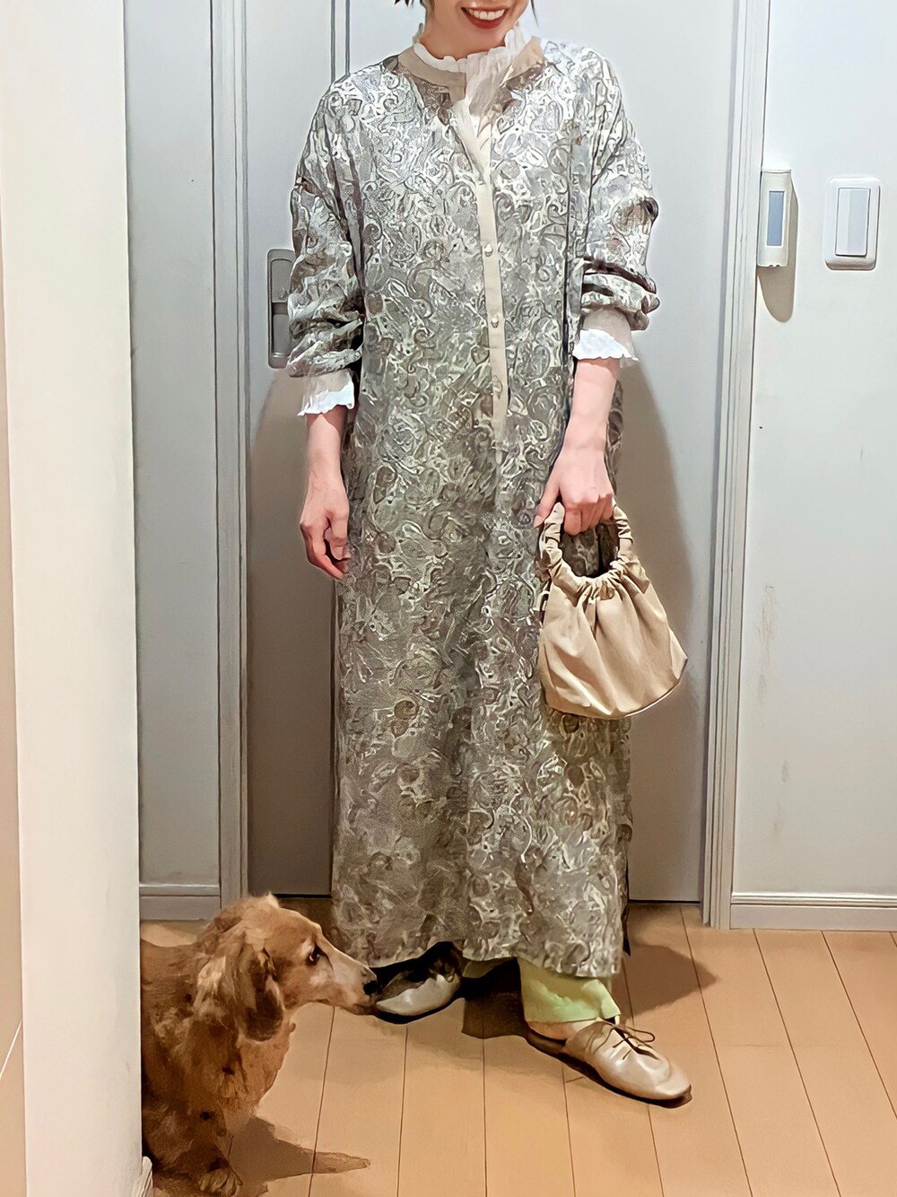 ご覧いただきありがとうございます♪ いいね・save・フォローいただくとうれしいです♪ 淡色ワントーンコーデです。 白のインナーでよりキレイめにし、袖をたくし上げる事でロングワンピースをスッキリと見えるように着ています♪