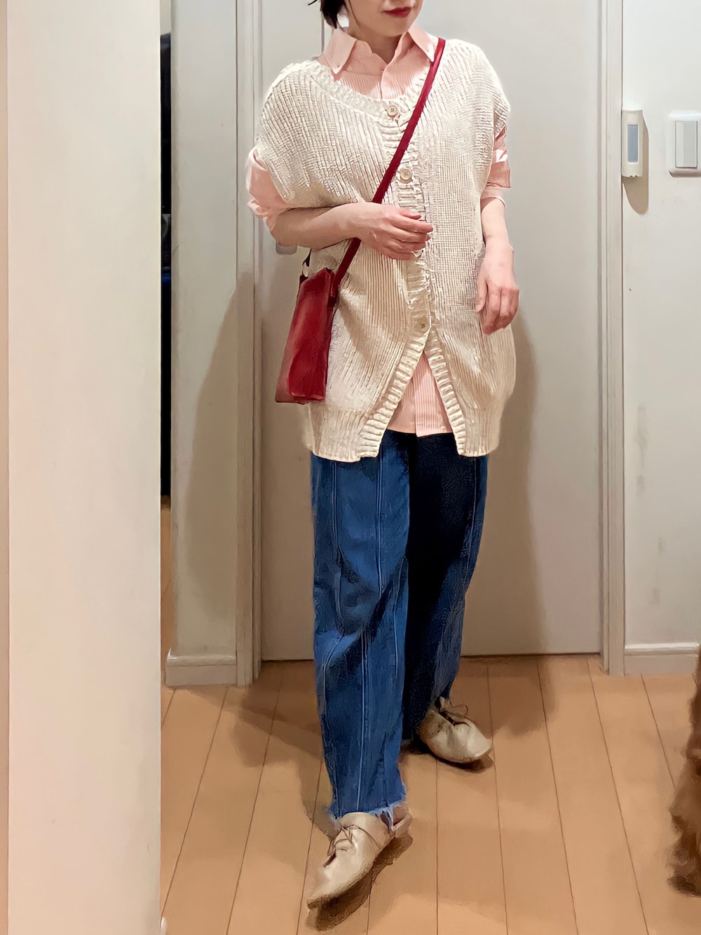 ご覧いただきありがとうございます♪ いいね・save・フォローいただけると嬉しいです♪ カジュアルになり過ぎないように、ベストを合わせて色味のあるバッグをポイントにしました♪