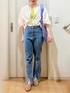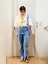 ご覧いただきありがとうございます♪ いいね・save・フォローいただけると嬉しいです♪♪♪ イエローのインナーで明るくカジュアルに ブラウスを羽織り、前だけインする事で すっきりとさせました。