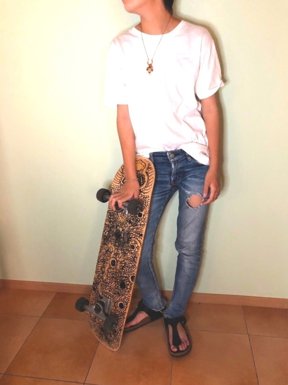 学校行く前に、ちょっとだけスケボーに しろT、スケボーで転んでやら、汗やらですぐ汚します Instagram⇨@sa_sa_ne