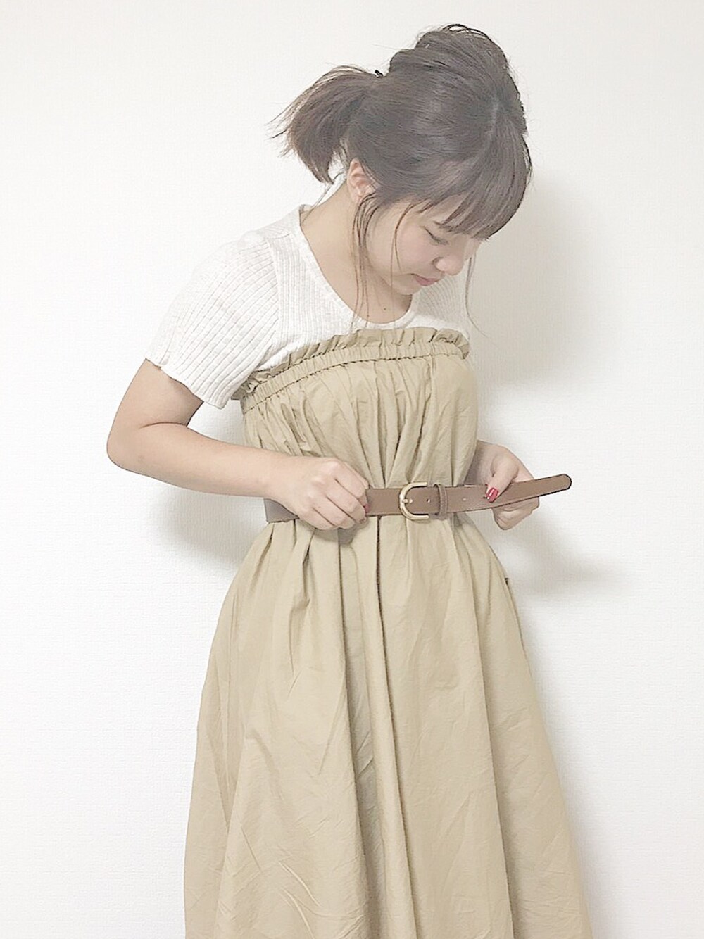 ロングスカートを胸のとこまで上げて ベアワンピっぽくなるようにしたよ ‪☺︎‬ 短いスカートでも下にデニム履いたら 絶対可愛いと思うなあ! スカート広がるからベルトで ウエストマークして着こなした◎