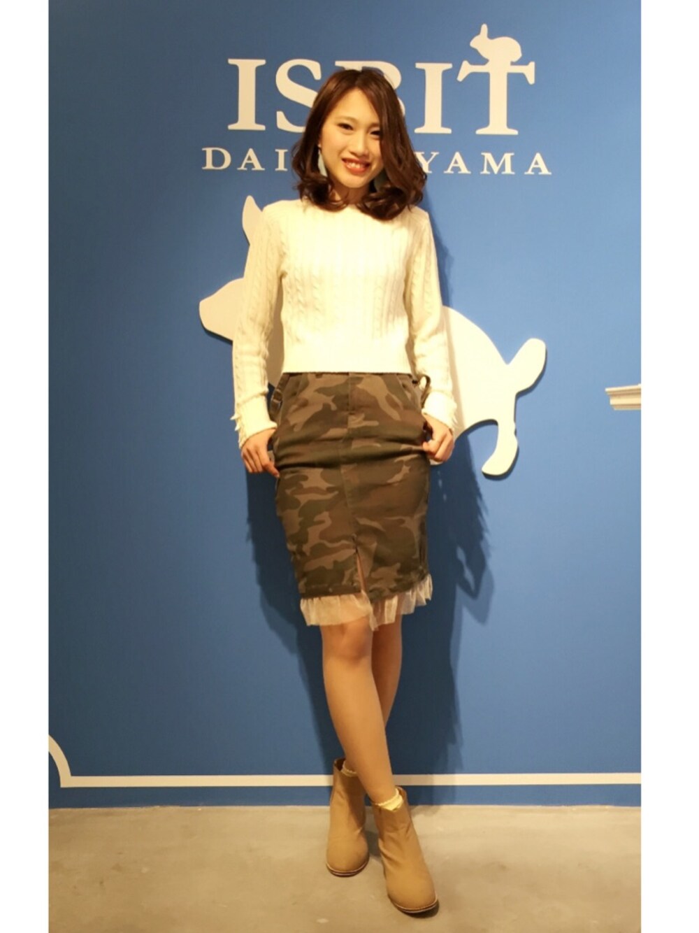 雑誌多数掲載の大人気春ニット💓 袖にちっちゃなリボンが付いていてとても可愛いんです♡ カモフラのタイトスカートは、かなり伸縮性のある生地なので凄く動きやすいんです💫 裾のチュールは取り外し可能♡