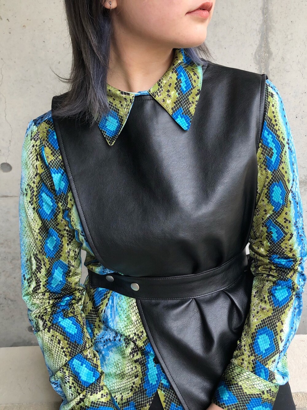 アルのベスト「ディフォメーションフェイクレザーベスト」を使ったコーディネート