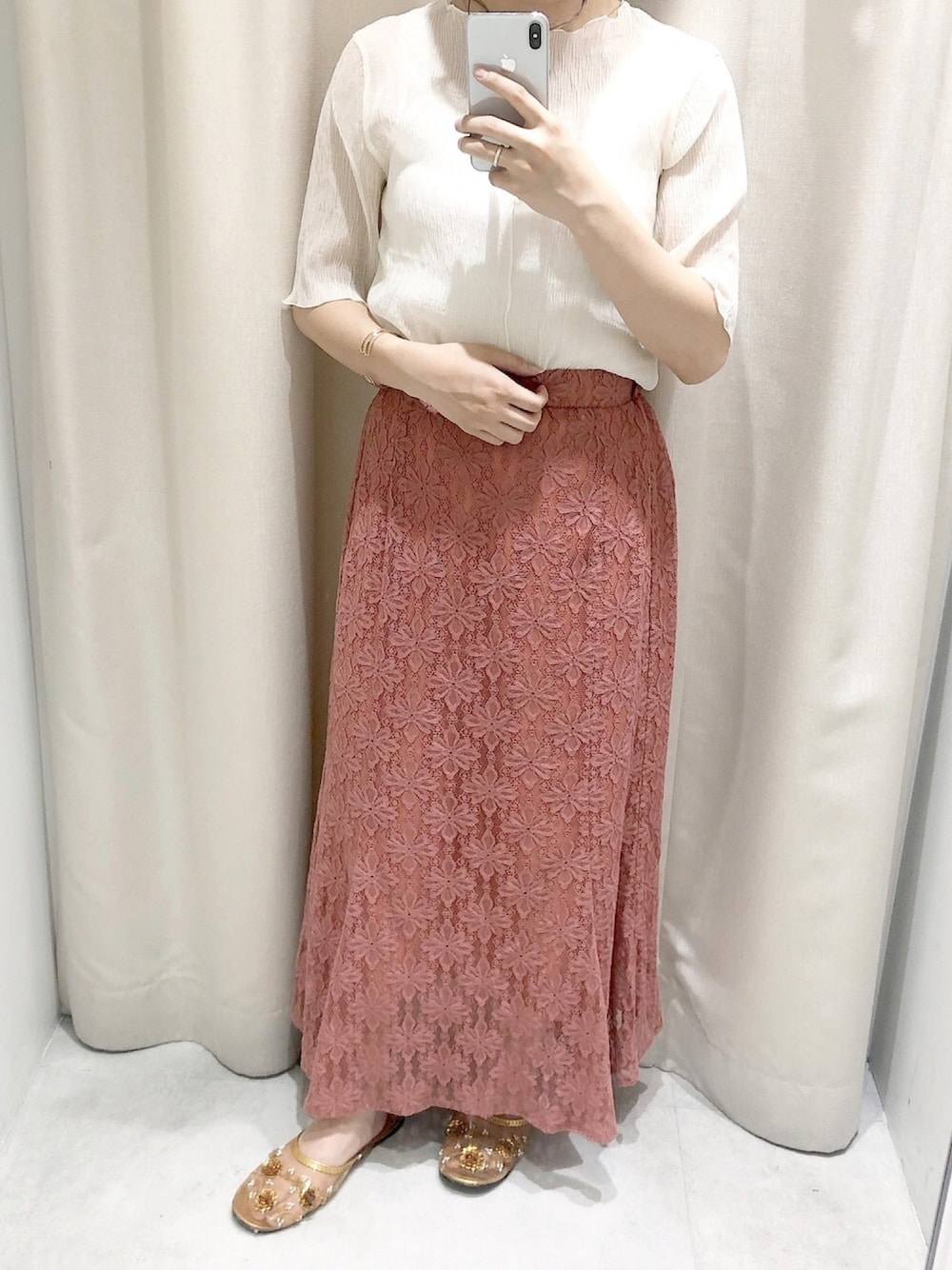 大人気のくしゅくしゅシアーブラウス♡ 袖の丈感もちょうど良くて二の腕が気にならないです! スカートも若干マーメイドスカートのようになっていて裾のレースが歩くとひらひらする感じがとても可愛いです🕊