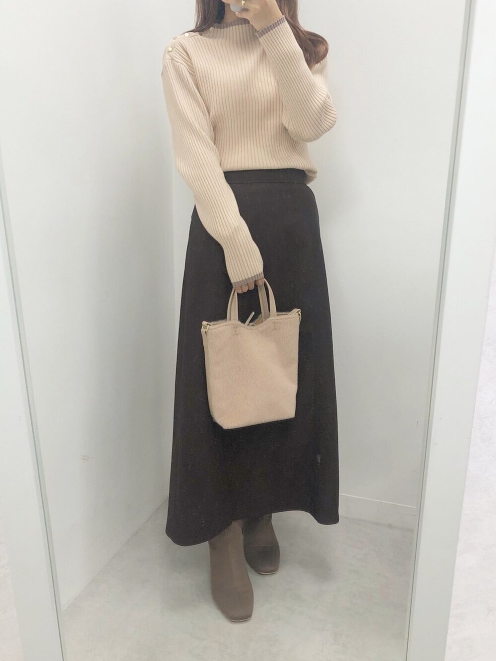 着用トップスについて -------------------- 透け感:なし 伸縮性:あり 生地の厚さ:普通 ------------------- サイズ感:体にフィットするサイズ感 素材感: リブニットで伸縮性がある 着心地: 伸縮性があるため着やすい 着用スカートについて -------------------- 透け感:なし (裏地:なし) 伸縮性:なし 生地の厚さ:普通 ------------------- サイズ感:足首くらいまでの着丈。 素材感: レザーのような素材感 着心地: スリットが入っているので動きやすい