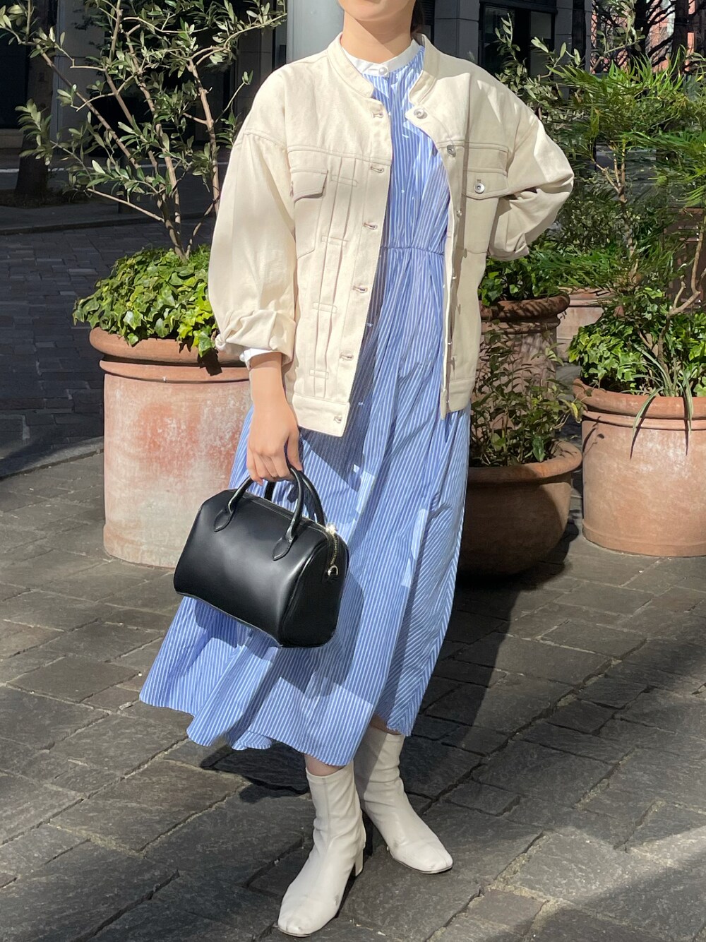 咲栄(natural couture)のデニムジャケット「程よい抜け感が魅力 ピンタックデザインバンドカラーGジャン」を使ったコーディネート