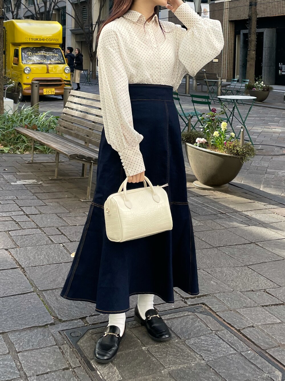 ブラウス×デニムは一気に春らしくなりますね🌸スカートはとてもストレッチが効いているので履き心地抜群です!