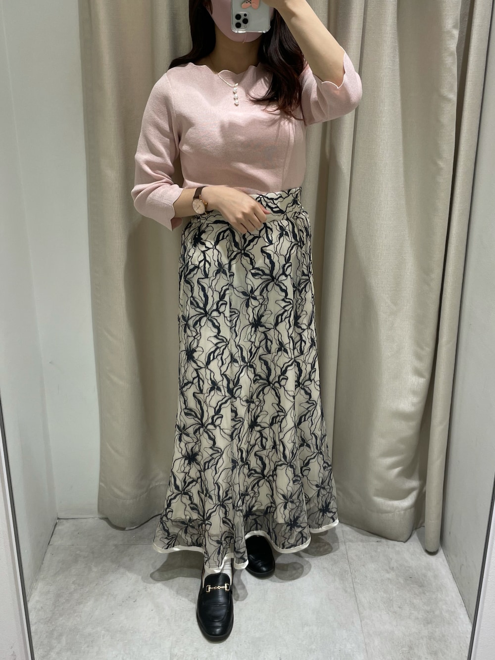 こちらのニットは首元と袖がスカラップになっています💖 程よく首周りが空くこと、手首が見える丈感の為とてもスッキリ見えするニットです◎