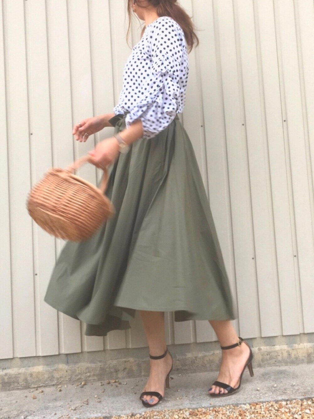 こんばんは✨ ドットシャツトップス✖︎フレアスカート✖︎サンダル✖︎かごバック guのパンプス、サイズ小さいと思ってたら大丈夫だった上に1480円になってたんで買っちゃいました🙈♡ そしてフレアスカートデビュー♡←遅っw ふわっとなってくれて嬉しい☺️♡ 見て頂きありがとうございました(๑˃̵ᴗ˂̵)♡