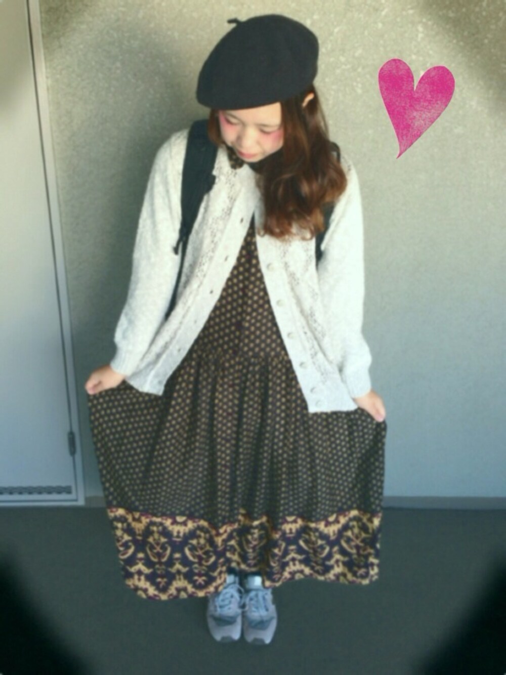 BEAMSの柄ワンピースと ベレー帽の組み合わせ◎