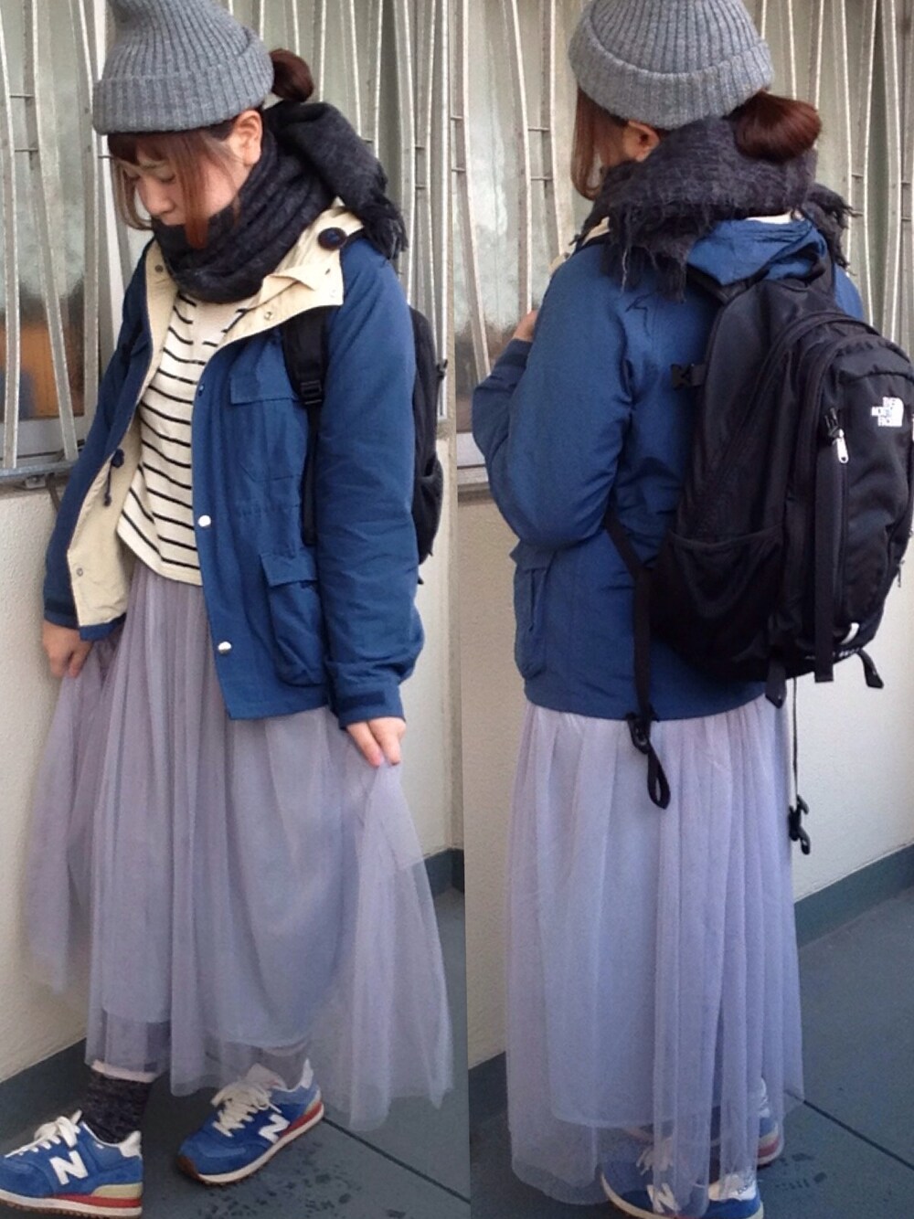 マウンテンパーカーBEAMSBOY ボーダートップスKastane スニーカーNB マフラーーLOWRYSFARM ニット帽used カジュアルだけど女の子らしく。