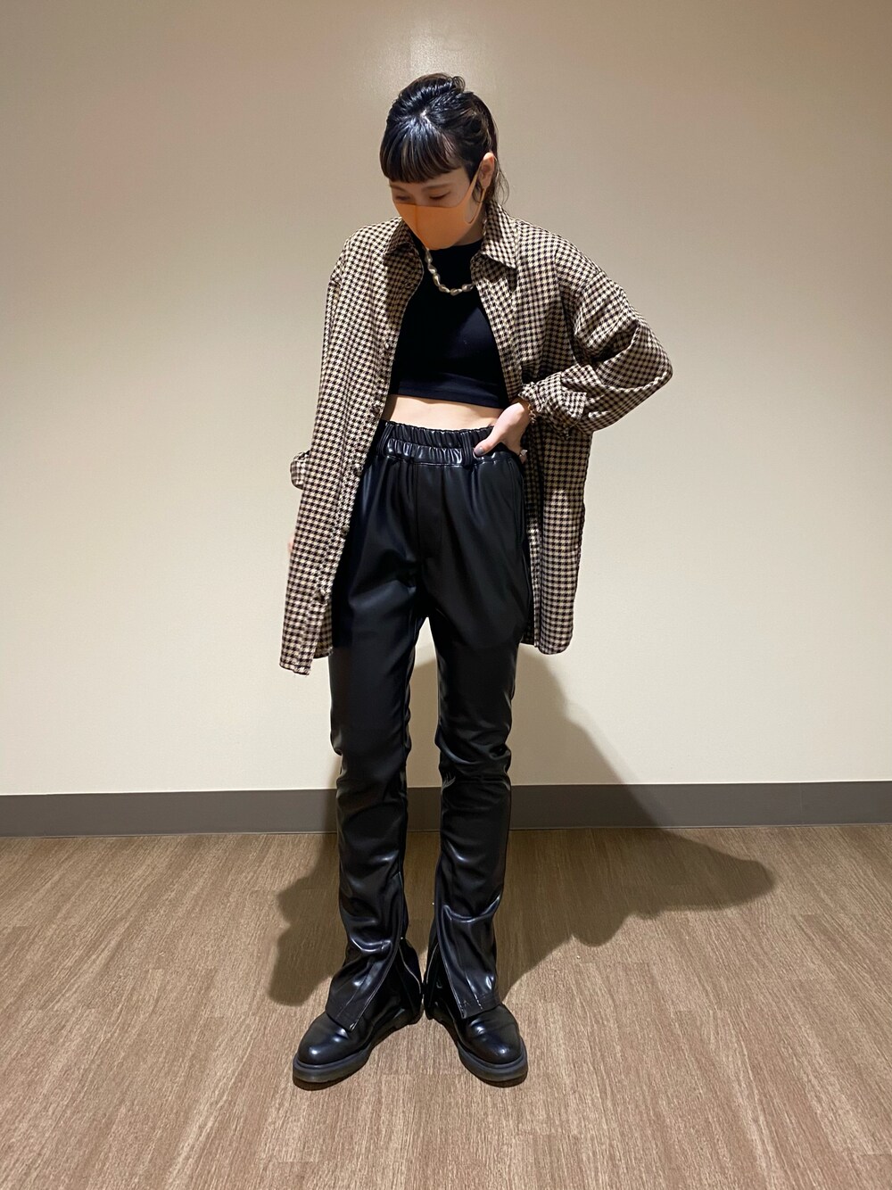レザーパンツとカジュアルシャツで。