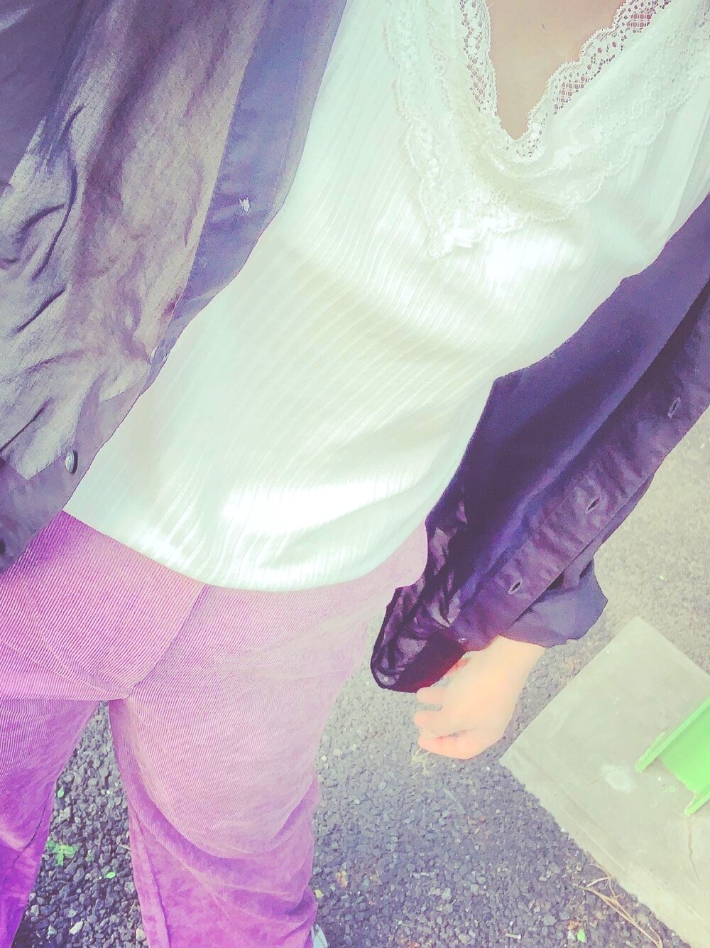 ブラック系のシャツ/ブラウス、ホワイト系のタンクトップ、パープル系のパンツを着用したレディースの秋コーディネートの1枚目の写真