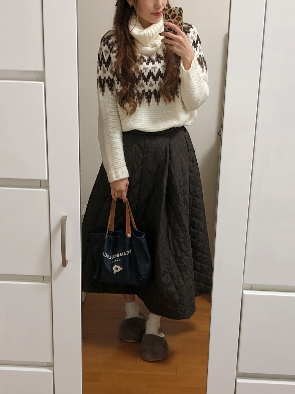 今日は大好きなブラウン系🤎 ブラウンのキルティングスカートに合わせるのいつも白になっちゃうけど、黒で合わせてみたいなぁ。 と、思って今日も白になった😂😂