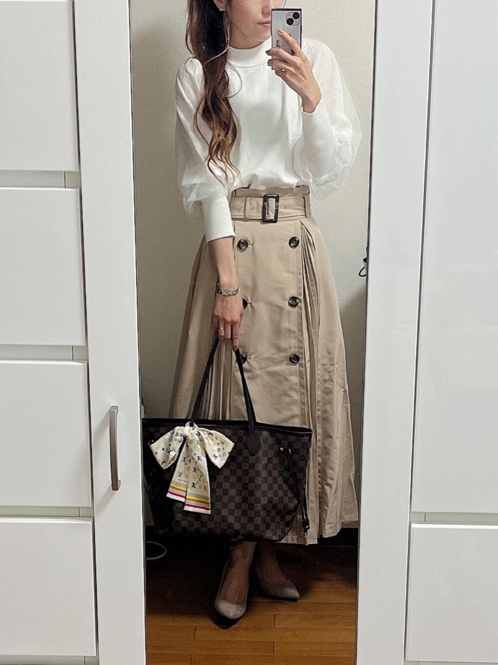 役員会の顔合わせコーデ🌸 ベージュのトレンチスカートかわいすぎるー🤎 白×ベージュの王道コーデで行ってきます♫ バッグにはスカーフを巻いて🌈